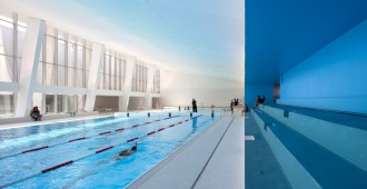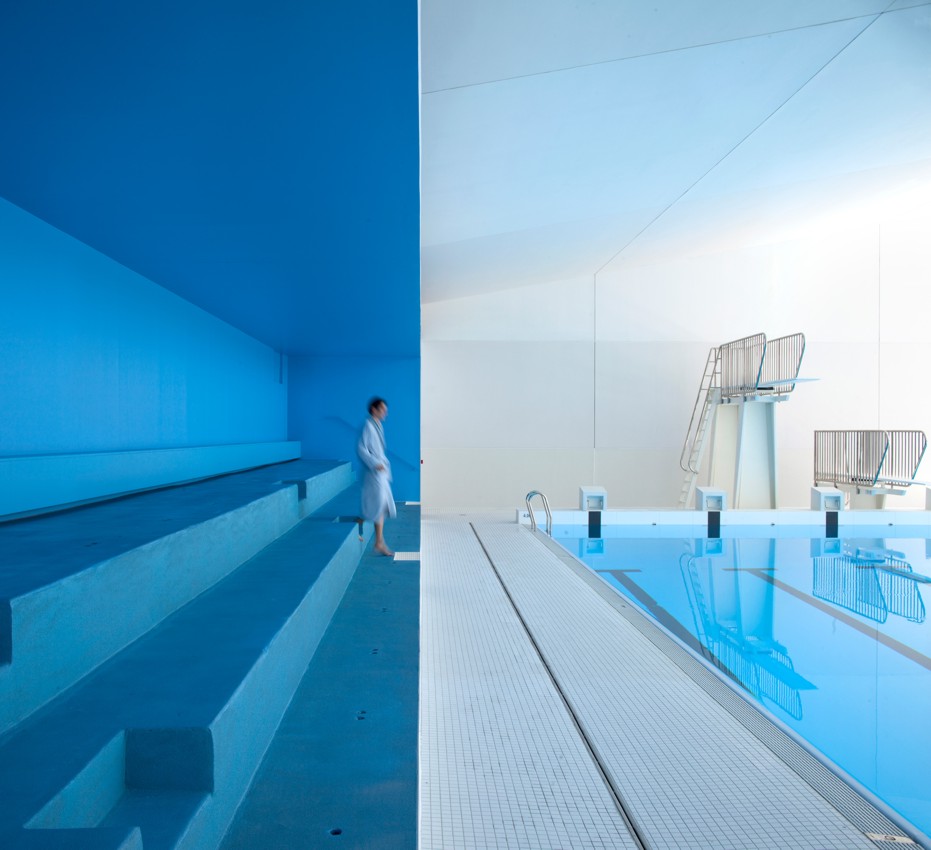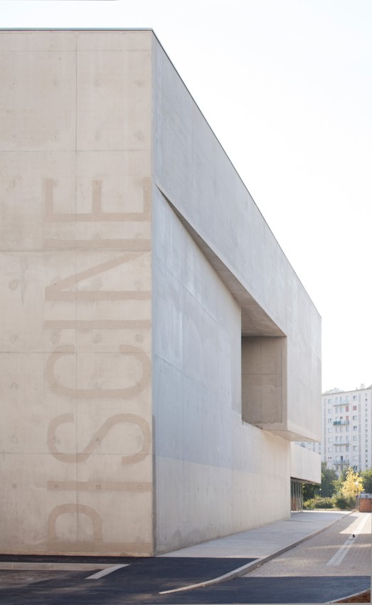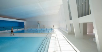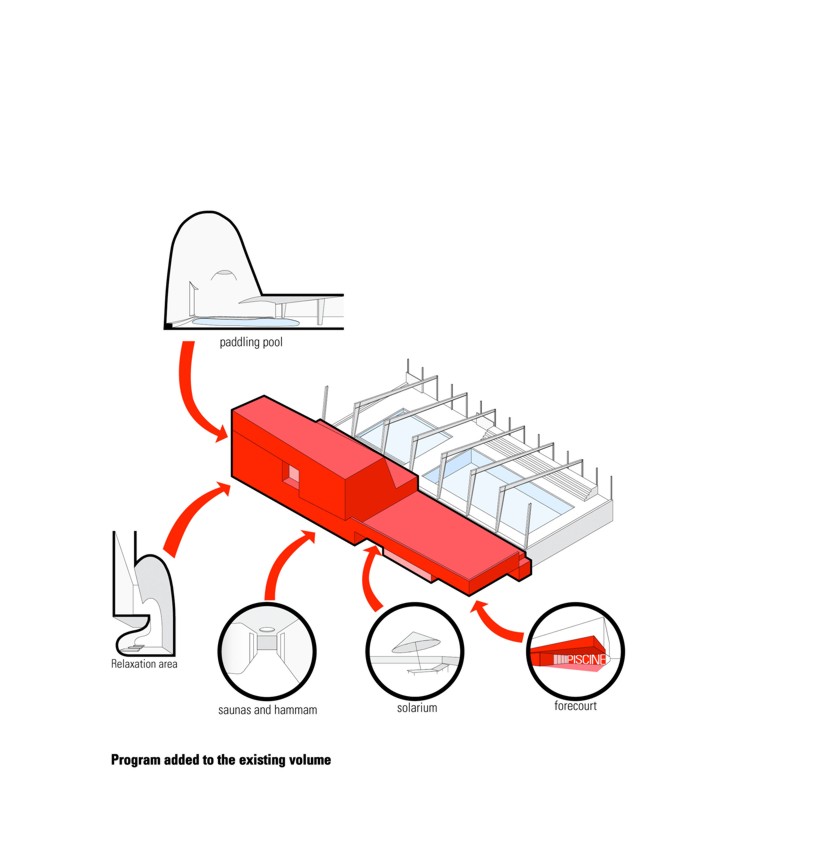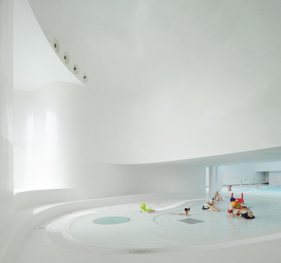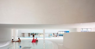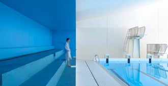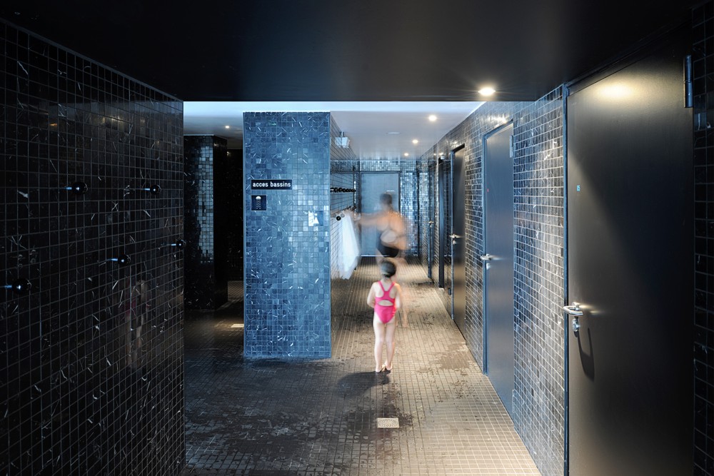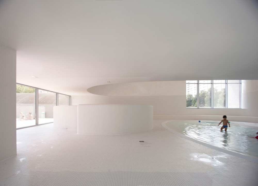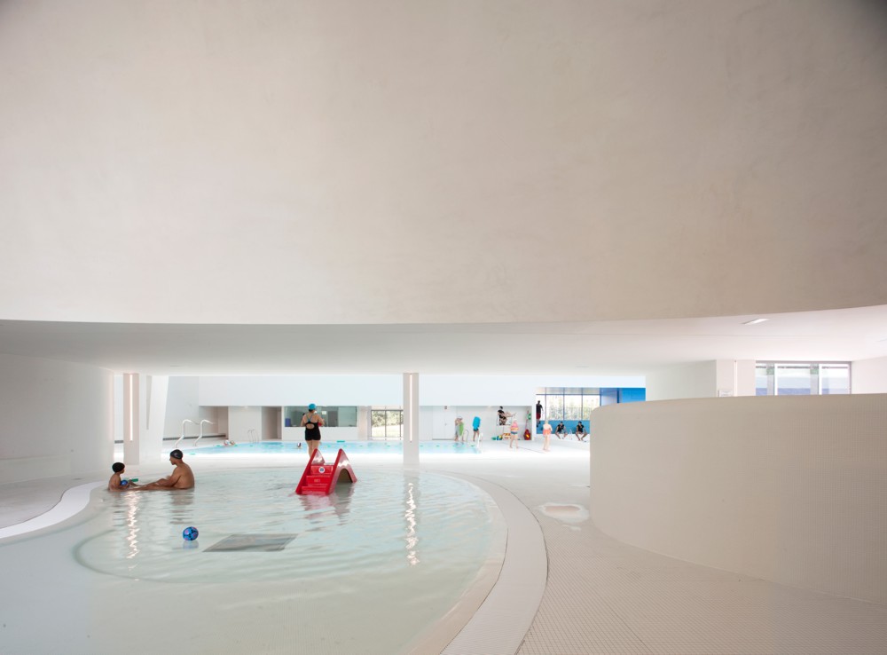 The purpose of our project, in an urban redevelopment area, is to transform the building’s image. The refurbishment and extension form a harmonious mineral body. The extension is in light grey concrete, and the original building, with external insulation, is faced with cement in the same shade. This minerality is continued through to the hall floor, in Lucerne quartzite laid as opus incertum. The scale of the new building, reinforced in this way, displays its strong urban presence. Its large cantilever and forecourt provide a generous amount of public space. A play of light recalls the reflection in the water on the east facade. The exterior signing is on the same scale as the building, and the archway serves as a giant sun-break. The project creates a break in time, with unforgettable ambiances, soft lighting, fluid architectural promenades, and curves replacing right-angles. The distribution area is flooded with unusual blue-tinged aquatic light, provided by a horizontal porthole in the bottom of the children’s paddling area. The light changes with the movement of the water. The space of the double-height relaxation area is encompassed by curved shapes; an attractive rounded window frames the view of the garden. The architecture of the existing large area (two pools) is conserved. The incline of the structure is emphasised; the subtle play of oblique lines also adds a contemporary touch. The paddling pool offers children the feeling of being wrapped in a cocoon. The area is curved, which reduces sound reverberation naturally. The tall bay window floods the small round pool with sunlight. The place is designed to appeal to children’s imagination. The large terrace is treated like a beach, with a tall concrete safety guard providing bathers with privacy. This is a place for discovery, in harmony with the ergonomics of the body.