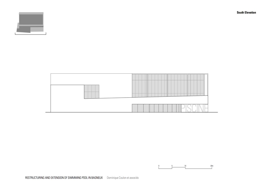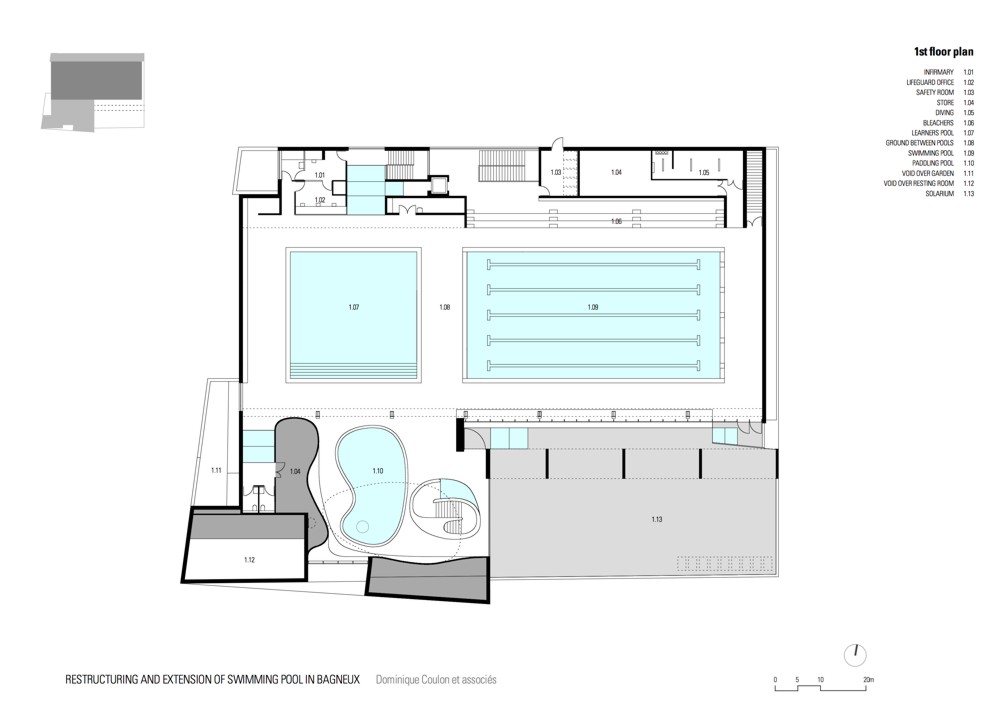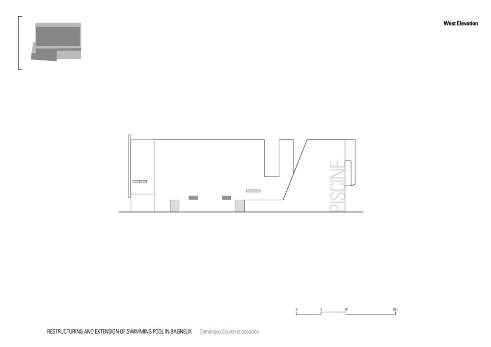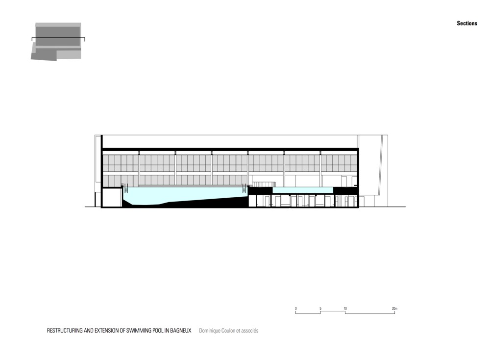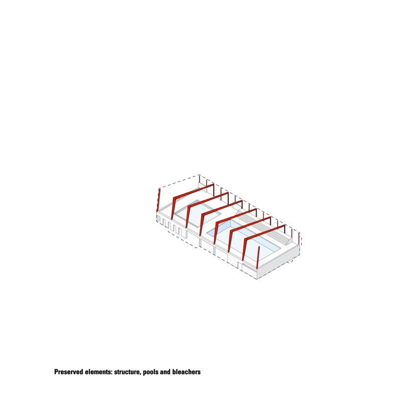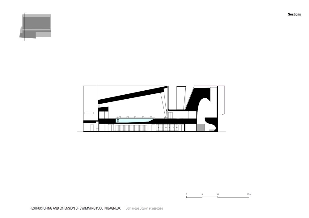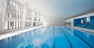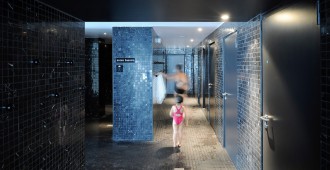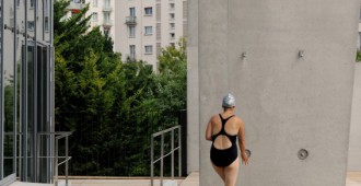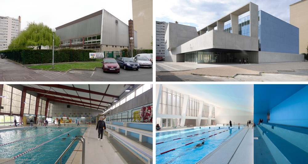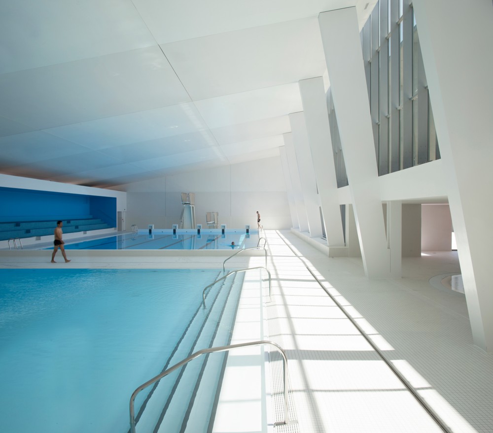 The purpose of our project, in an urban redevelopment area, is to transform the building’s image. The refurbishment and extension form a harmonious mineral body. The extension is in light grey concrete, and the original building, with external insulation, is faced with cement in the same shade. This minerality is continued through to the hall floor, in Lucerne quartzite laid as opus incertum. The scale of the new building, reinforced in this way, displays its strong urban presence. Its large cantilever and forecourt provide a generous amount of public space. A play of light recalls the reflection in the water on the east facade. The exterior signing is on the same scale as the building, and the archway serves as a giant sun-break. The project creates a break in time, with unforgettable ambiances, soft lighting, fluid architectural promenades, and curves replacing right-angles. The distribution area is flooded with unusual blue-tinged aquatic light, provided by a horizontal porthole in the bottom of the children’s paddling area. The light changes with the movement of the water. The space of the double-height relaxation area is encompassed by curved shapes; an attractive rounded window frames the view of the garden. The architecture of the existing large area (two pools) is conserved. The incline of the structure is emphasised; the subtle play of oblique lines also adds a contemporary touch. The paddling pool offers children the feeling of being wrapped in a cocoon. The area is curved, which reduces sound reverberation naturally. The tall bay window floods the small round pool with sunlight. The place is designed to appeal to children’s imagination. The large terrace is treated like a beach, with a tall concrete safety guard providing bathers with privacy. This is a place for discovery, in harmony with the ergonomics of the body.