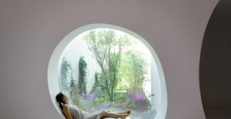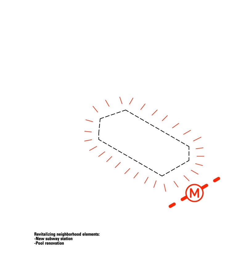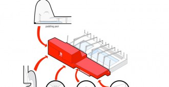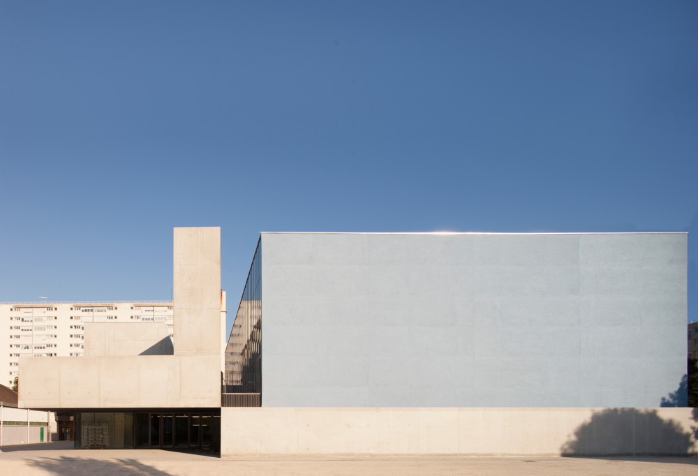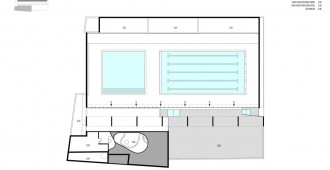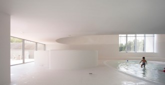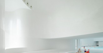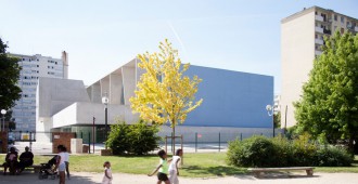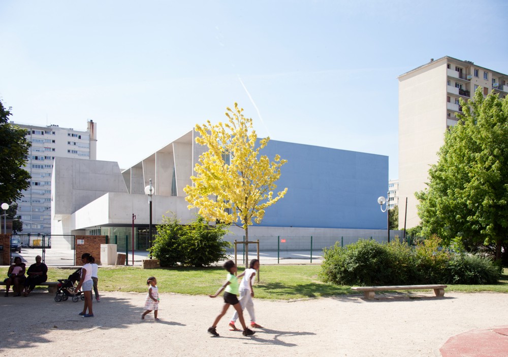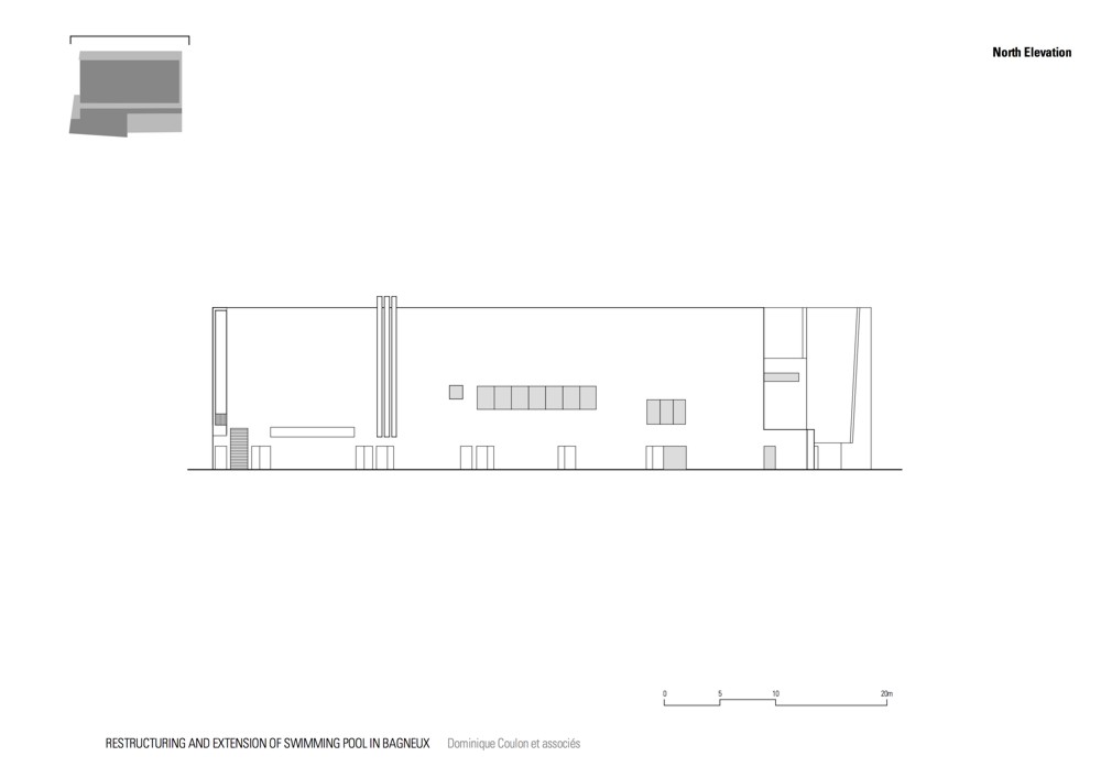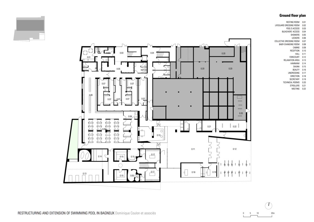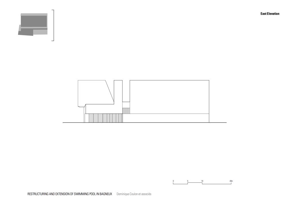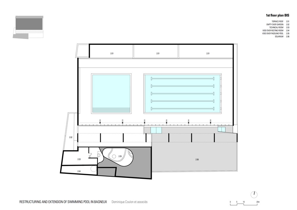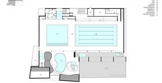 The purpose of our project, in an urban redevelopment area, is to transform the building’s image. The refurbishment and extension form a harmonious mineral body. The extension is in light grey concrete, and the original building, with external insulation, is faced with cement in the same shade. This minerality is continued through to the hall floor, in Lucerne quartzite laid as opus incertum. The scale of the new building, reinforced in this way, displays its strong urban presence. Its large cantilever and forecourt provide a generous amount of public space. A play of light recalls the reflection in the water on the east facade. The exterior signing is on the same scale as the building, and the archway serves as a giant sun-break. The project creates a break in time, with unforgettable ambiances, soft lighting, fluid architectural promenades, and curves replacing right-angles. The distribution area is flooded with unusual blue-tinged aquatic light, provided by a horizontal porthole in the bottom of the children’s paddling area. The light changes with the movement of the water. The space of the double-height relaxation area is encompassed by curved shapes; an attractive rounded window frames the view of the garden. The architecture of the existing large area (two pools) is conserved. The incline of the structure is emphasised; the subtle play of oblique lines also adds a contemporary touch. The paddling pool offers children the feeling of being wrapped in a cocoon. The area is curved, which reduces sound reverberation naturally. The tall bay window floods the small round pool with sunlight. The place is designed to appeal to children’s imagination. The large terrace is treated like a beach, with a tall concrete safety guard providing bathers with privacy. This is a place for discovery, in harmony with the ergonomics of the body.