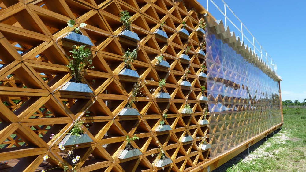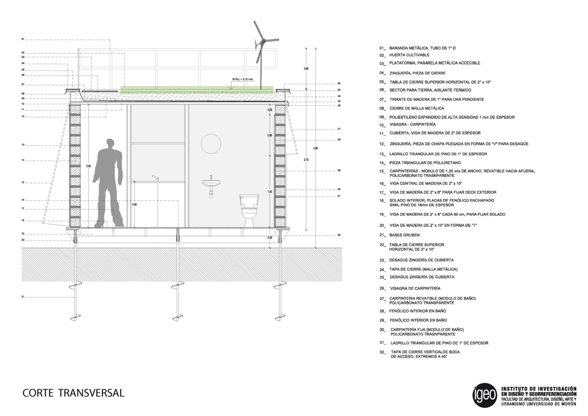 A los sistemas pasivos normales ya utilizados en los módulos anteriores, se le suman calefacción y refrigeración por geotermia, calentamiento de agua por energía solar mediante termo paneles en la cubierta, acumulación de agua de lluvia para riego y servicios varios, distintos detalles de aislación según la orientación de cada cerramiento y las épocas del año , la posibilidad de transformar a la pared de ladrillos en un muro «trombe» para calefaccionar el interior en invierno o de permitir que la brisa pase en verano removiendo las aislaciones, y la posibilidad de utilizar la fachada y la cubierta como un soporte verde que intercambia dióxido de carbono en oxigeno contribuyendo así con el ambiente circundante .