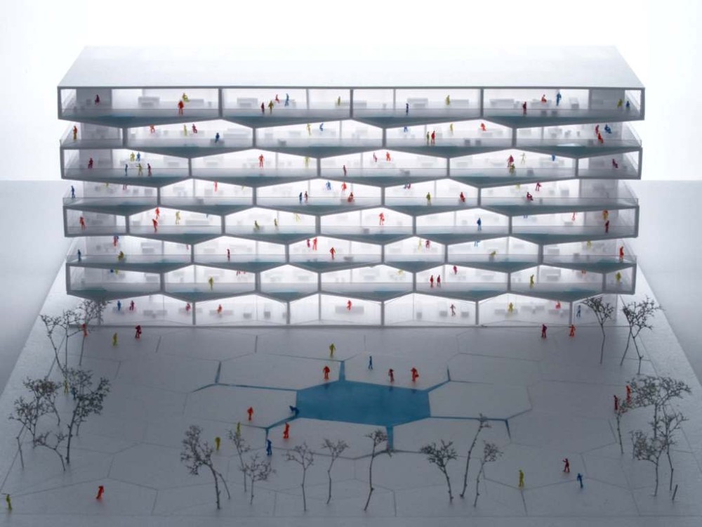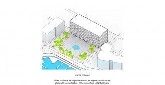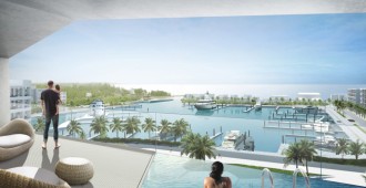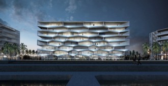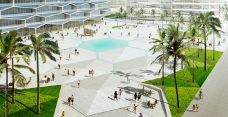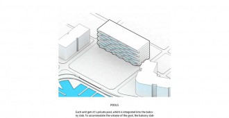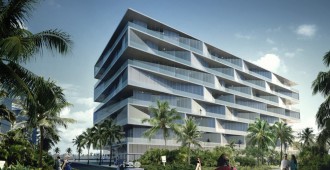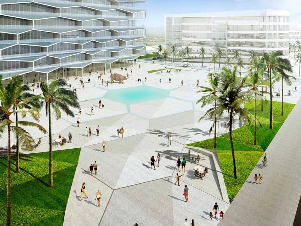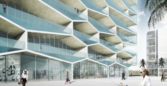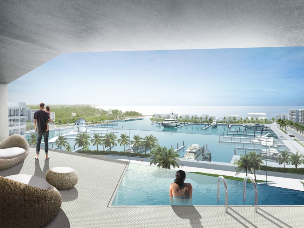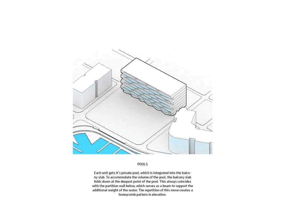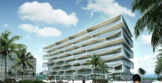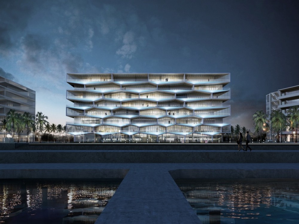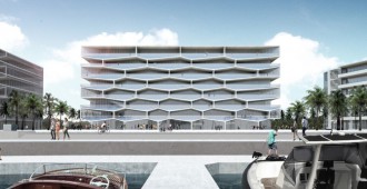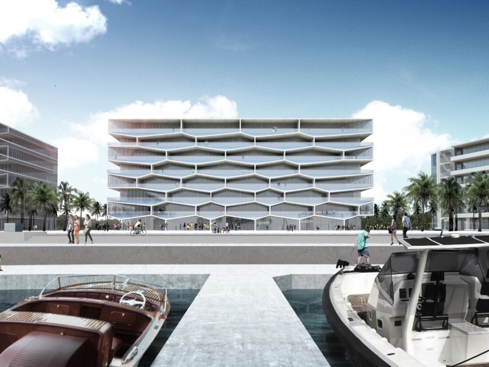 Bahamas > BIG + HKS + MDA han dado a conocer el diseño del ‘Honeycomb Building’ , un edificio de viviendas de aproximadamente 16.000 m2 con una piscina privada en cada balcón con vistas al puerto deportivo, y una plaza pública junto al condominio en la isla de New Providence ….