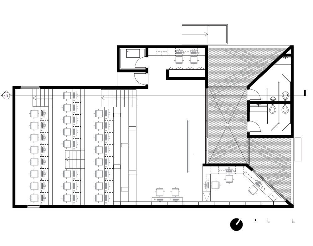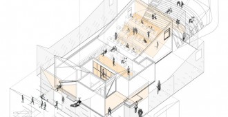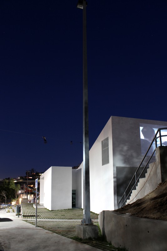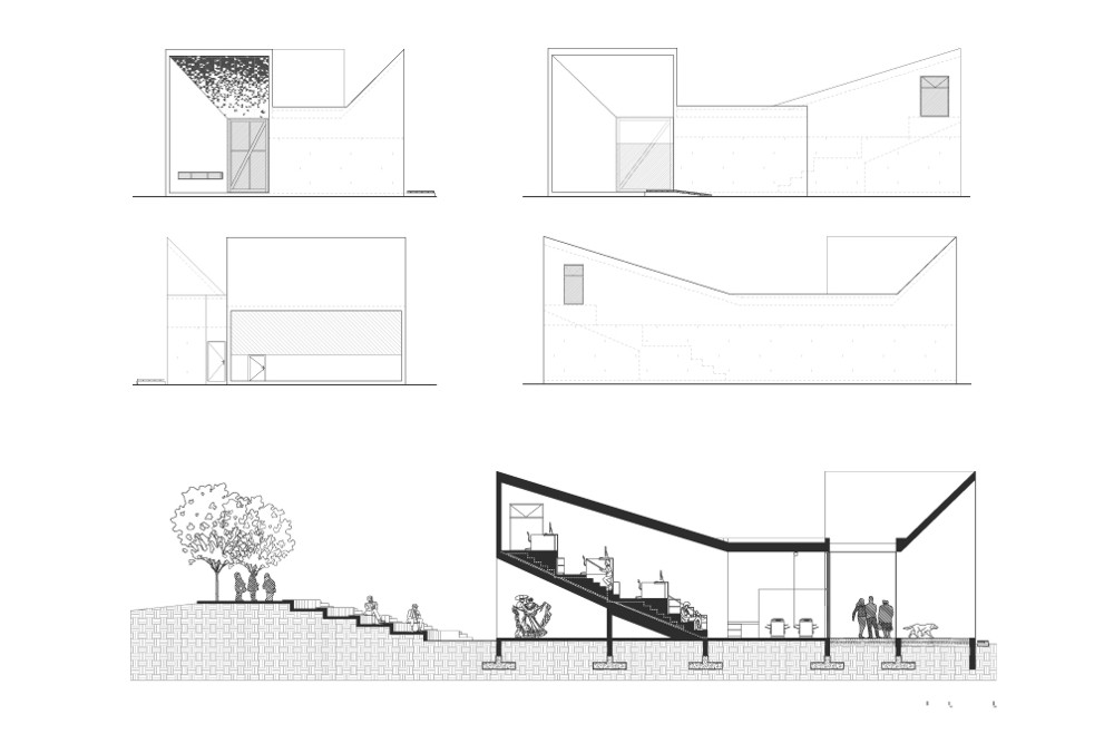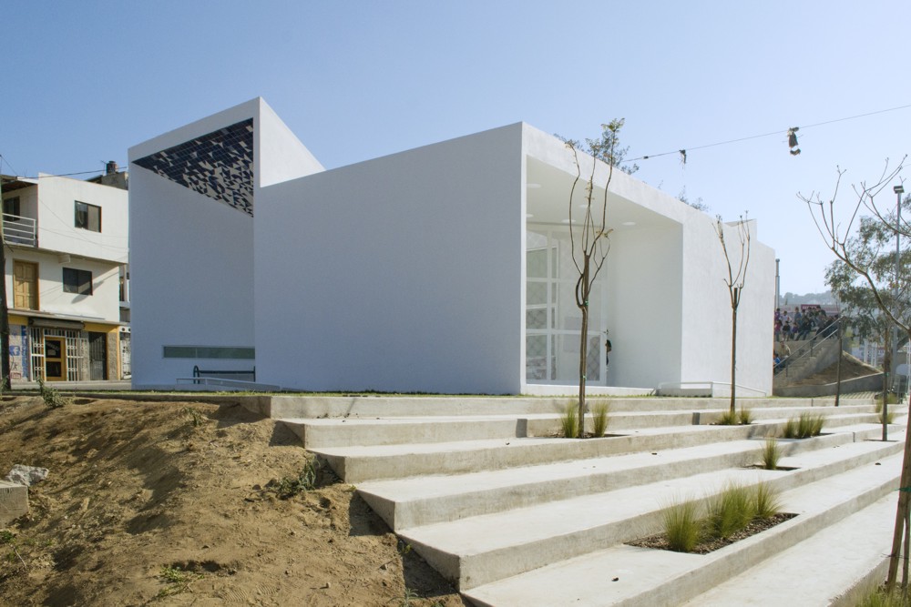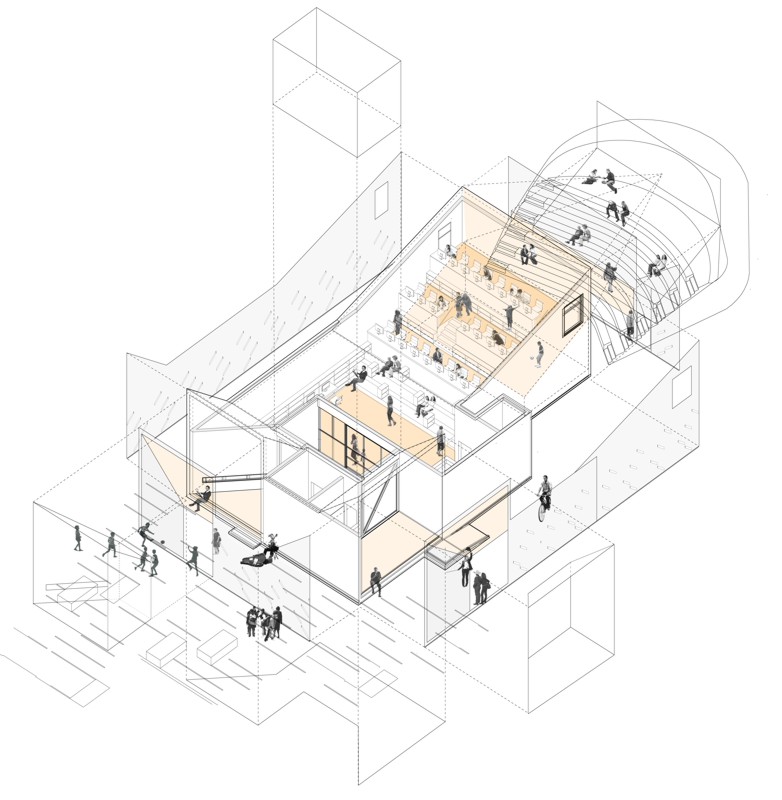 La propuesta de la biblioteca constituye un espacio de solo 220 metros cuadrados. El reto espacial y el cuestionamiento sobre como una biblioteca digital puede contribuir a la ciudad, han generado una nueva tipología para la biblioteca: un espacio colectivo donde el aprendizaje y la interacción de la información va mas allá de la simple accesibilidad de estos servicios. Su arquitectura se abre a una serie de escenarios tanto al interior como al exterior. La forma del edificio ofrece una sala multiusos interna en diversas plataformas donde se pueden dar conferencias, obras de teatro, talleres, espacios de lectura y acceso a computadoras. La pendiente generada por los desniveles articula un vacío en su exterior en la parte posterior del edificio, donde se propone un foro al aire libre. Una cascada secuencial de espacios hace que el edificio de forma lisa y hermética se abra completamente al público aún cuando no este en horario de función. La intención primordial es crear y hacer ciudad por medio de la forma de arquitectura que aporte y de iniciativa a la convivencia cívica de sus espacios adyacentes.