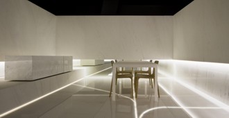«Una estereotomía de gran formato pone de manifiesto las bondades de la piedra natural.Dos tipos de mármol blanco, con vetas ligeramente grises. Tres tipos de acabado, pulido, abujardado y arenado, despliegan una gama de diez texturas en un espacio de contrastes dentro de la continuidad. Los cambios cromáticos de la luz natural se reflejan en […]...