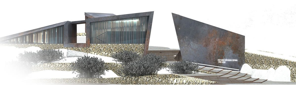 Dovendo realizzare un complesso composto da tre distinti componenti (rifugio, locale nolo attrezzature, ricovero mezzi operativi) si è pensato di svolgere l'edificio secondo una sezione circa costante con sviluppo in lunghezza a seguire la curva di livello di margine del pianoro di arrivo delle piste. In questo modo il rifugio assume pianta spezzata in due punti, cinge il pianoro di arrivo delle piste creando un ambito a corte e segna col costruito il valico tra la zona di circolazione viaria e la zona escursionistica montana. Anche la definizione degli spiccati avviene nell'ottica di un dialogo con il paesaggio, infatti i volumi si staccano dal suolo con un movimento tettonico e fluido a partire dalla copertura che si genera da terra e delimita con tagli netti a salire lo stacco al cielo di tutto l'edificio. Allora la conformazione finale mostra un'architettura di chiaro segno contemporaneo, con superfici nette e spigoli vivi, a richiamo della pietra tagliata e vicina all'ideale di austerità montana.