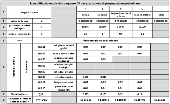 Nel decreto uno schema esemplificativo illustra il metodo di calcolo applicato alla progettazione preliminare di un edificio scolastico. Il primo passo è la scomposizione della prestazione in categorie, estrapolate dal relativo elenco contenuto in allegato al Regolamento, nel caso specifico: opere edilizie, opere strutturali, impianti meccanici e impianti elettrici. Per ciascuna delle 4 categorie viene applicata la formula CP=V×G×Q×P, giungendo ad un compenso di 7.631,20 euro al netto di spese ed oneri. I parametri G e Q sono facilmente desunti da tabelle allegate al decreto, al quale si rimanda.
