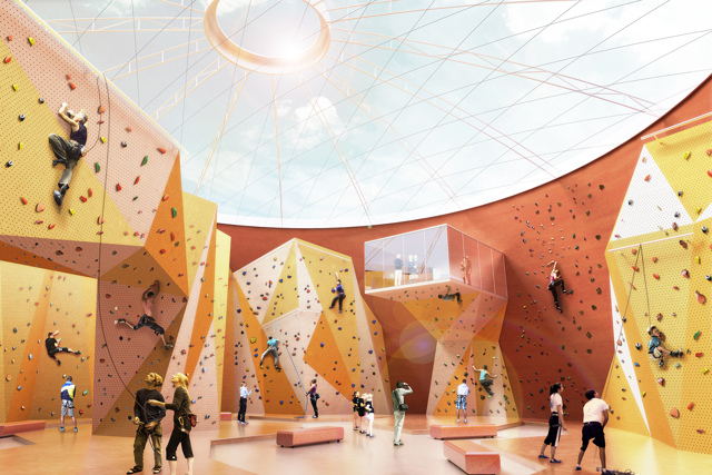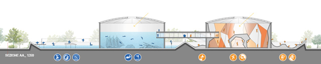 Infine, viene pensato un unico, nuovo, «edificio-percorso» che attraversa fluidamente l'area, offrendo anche affacci in quota all'interno dei serbatoi. L'edificio contiene servizi di supporto alle attività sportive. I progettisti hanno voluto mantenere la memoria e valorizzare la potenza comunicativa delle imponenti strutture industriali, che ibridandosi, diventano il perfetto scenario e contenitore delle attività previste.