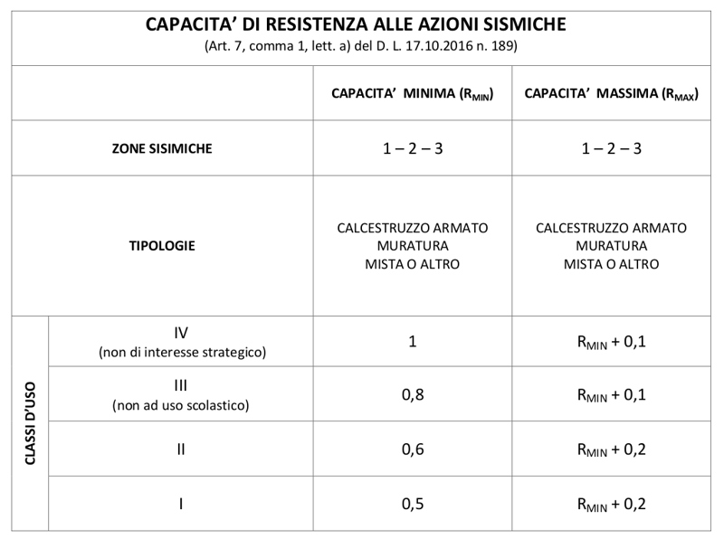 La capacità di resistenza (Rmin ed Rmax) è valutata come il rapporto tra l'azione sismica sopportabile dalla struttura e l'azione sismica che si utilizzerebbe nel progetto di una nuova costruzione per lo stato limite della salvaguardia della vita delle norme tecniche per le costruzioni di cui al testo unico Edilizia.