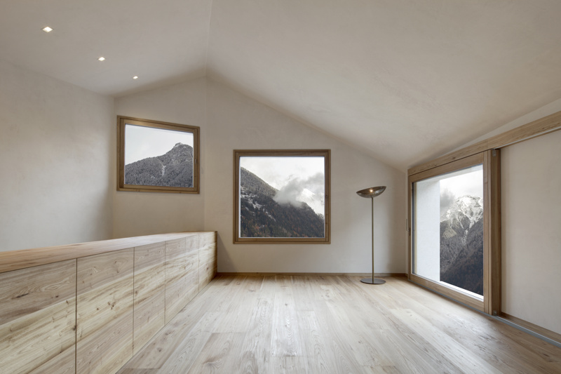 L'estremo rigore dell'esterno e la fedeltà alla naturalità dei materiali impiegati guida anche le scelte compiute per la realizzazione degli spazi interni, dove domina l'utilizzo di materie prime locali come il legno di quercia, il bronzo e le lastre di roccia Gneiss della Passiria, lavorati artigianalmente da maestranze locali per realizzare su misura arredi, infissi, porte, punti luce e pavimenti.