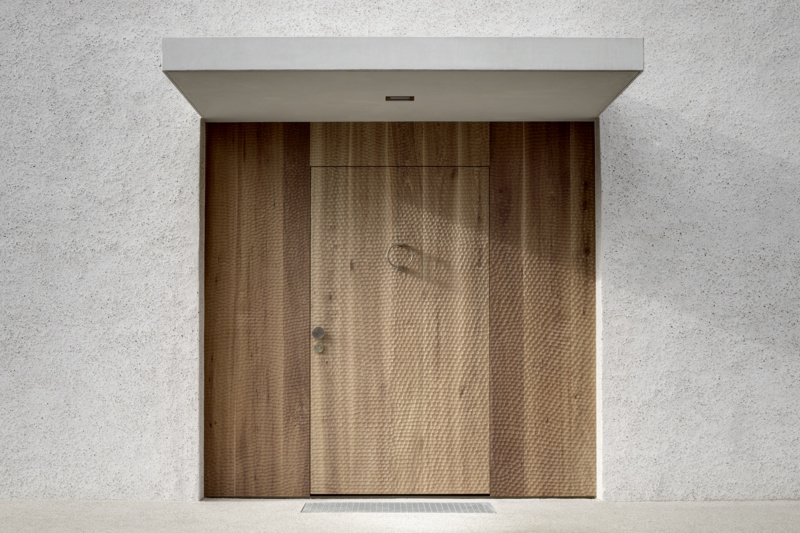 Per gli esterni, i fratelli Pedevilla, maestri nello studio della composizione di intonaci, hanno pensato ad una finitura esterna formata da sabbie locali, calce e cemento, in cui la tonalità chiara è resa dinamica da un effetto spugnato che cattura le sfumature della luce.