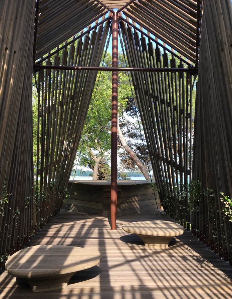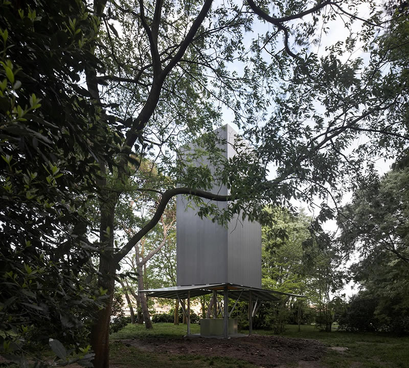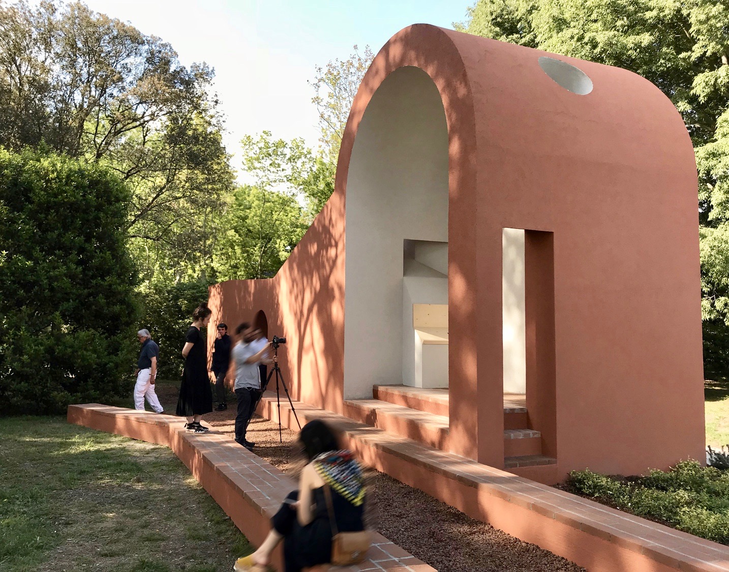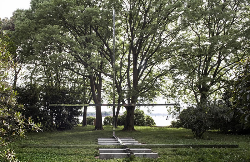 Quella progettata da Ricardo Flores e Eva Prats gioca sul contrasto: da una parte un muro molto semplice, rivestito di cocciopesto mostra un'unica piccola porta di ingresso, travalicata la quale lo spazio si apre con una piccola nicchia con un leggio, aperta verso il bosco, verso la natura e la laguna. È uno spazio di contemplazione laico, ci racconta Ricardo Flores (alla cappella di Flores i Prats Architects, da noi intervistati sull'isola di San Giorgio, dedicheremo presto un articolo, così come ad altre strutture che abbiamo trovato di grande interesse).