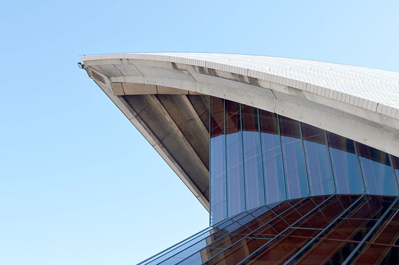 Situato sul lungomare al centro città, l'edificio, progettato dall'architetto danese Jørn Utzon nel 1956 è tutt'oggi un'architettura d'avanguardia: struttura complessa, che ne rese difficile il completamento, ultimato ben 11 anni dopo il suo inizio con sostanziali modifiche progettuali che l'hanno portato, nel 2007, ad essere dichiarato patrimonio dell'Unesco, oggi capace di ospitare più di mille eventi all'anno.