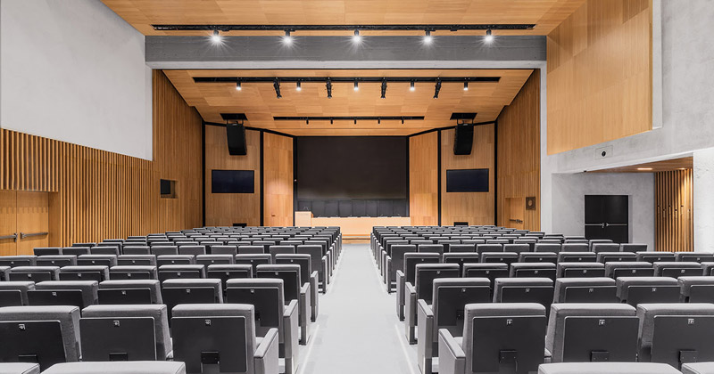 Progettata per ospitare più tipi di eventi, l'Aula Magna vanta una sofisticata tecnologia audio, video e luci: touchscreen in regia, sul podio e portatili permettono di predisporre le diverse configurazioni della sala.
