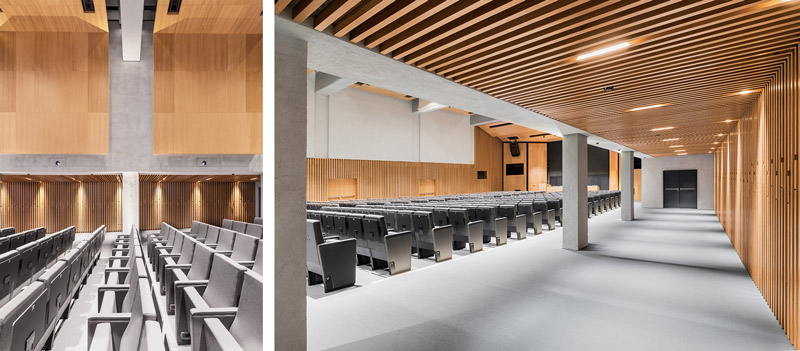 Gli elementi materici che disegnano lo spazio dell'auditorium sono la struttura di cemento faccia a vista, l'intonaco a grana grossa graffiato e il legno di rovere naturale, la loro composizione e il loro equilibrio rende leggibile l'Aula Magna secondo due ordini: uno basso, in pannelli di Celenit tinteggiati di grigio e listelli di rovere naturale, e uno superiore in cartongesso da un lato e con plafoni di rovere dall'altro.