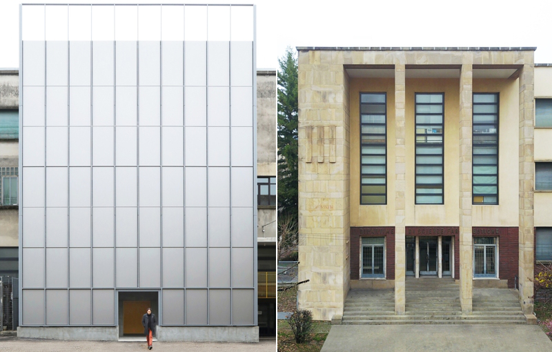 Gli ingressi a confronto: a sinistra la facciata di pannelli compositi di alluminio del nuovo volume; a destra l'ingresso realizzato negli anni Trenta. Fotografie di © Nicolò Galeazzi