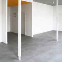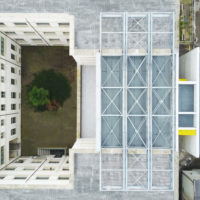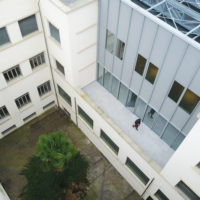 Nei volumi così ricavati sono stati realizzati, al primo e al secondo livello, dei grandi spazi che funzionano da ingresso e da connessione tra i laboratori. Per questi è stato poi creato un ingresso indipendente sul retro dell'edificio. Dai laboratori si entra e si esce per mezzo di scale metalliche, in parte di recupero, schermate verso l'esterno da pannelli compositi di alluminio, cangianti con la luce, che vanno a caratterizzare la facciata sul lato nord. Gli stessi pannelli rivestono anche la facciata dell'innesto verso il cortile. Tra le scale e il volume sospeso viene inserito un blocco di calcestruzzo armato in cui è inserito l'ascensore.