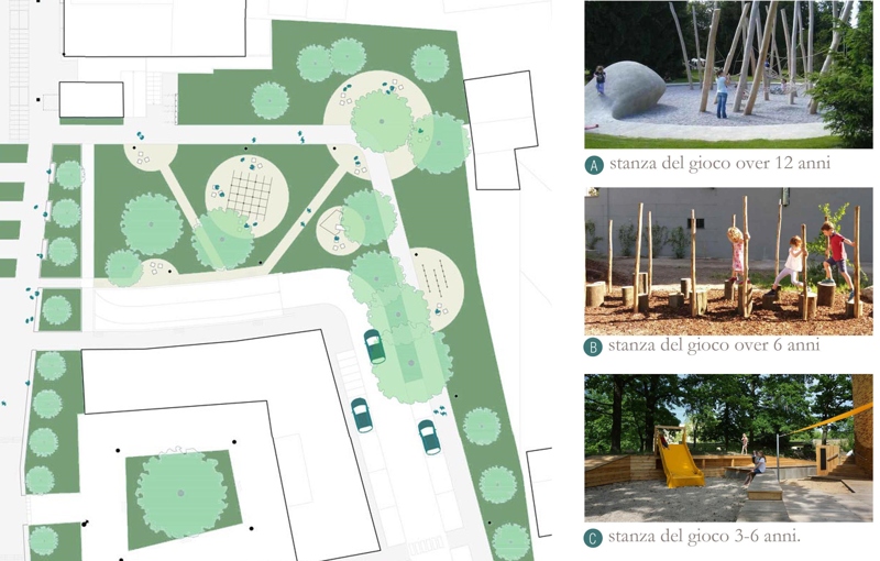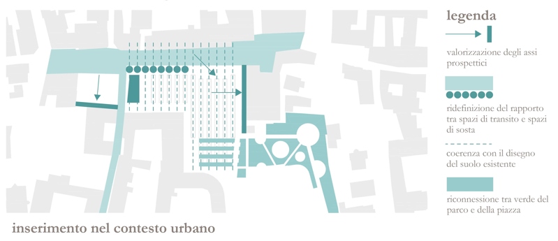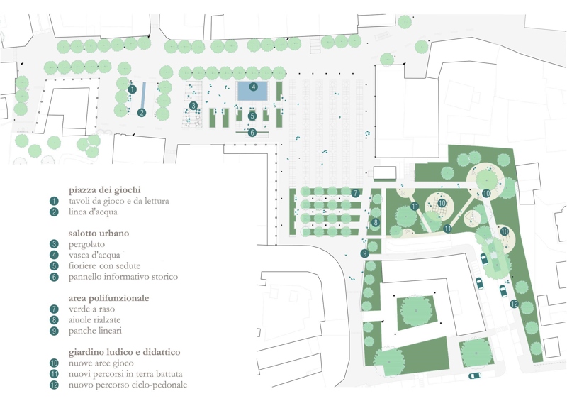 Il sistema-piazza è stato suddiviso in quattro ambiti distinti: il "salotto urbano", con un nuovo pergolato e la reintroduzione della fontana; la grande area polifunzionale per gli eventi, utilizzabile per mercato, cinema all'aperto, mostre, playground e pista di pattinaggio; un giardino ludico e didattico, con attrezzature per bambini differenziate per età; una piazza dei giochi e della lettura.