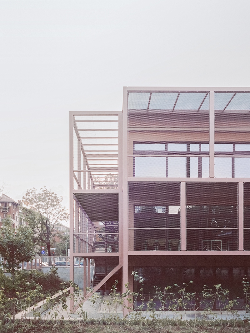 A trasformare la scuola è principalmente una nuova addizione: una struttura in acciaio, una sorta di involucro abitato che, oltre a funzionare come schermatura, include terrazze funzionali alla didattica e nuovi spazi connettivi. A disegnare il nuovo volume è un susseguirsi di telai completati da una rete metallica. Si gioca, dunque, con la permeabilità visiva.