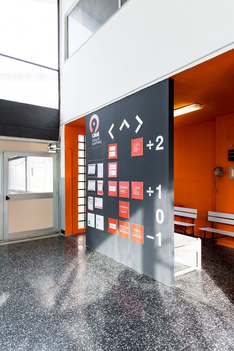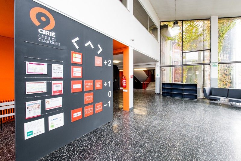 Atrio di ingresso della Casa di Quartiere con il pannello che aiuta ad orientarsi, © G124, fotografia di Alessandro Lana