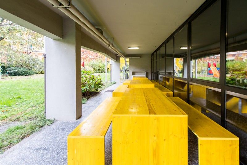 «Abbiamo utilizzato il colore per ridipingere gli ambienti. Il nero e l'arancione sono diventati il filo conduttore del nostro progetto. Abbiamo utilizzato arredi provenienti da un deposito del Comune e li abbiamo rimessi in circolo», aggiunge Maria Giulia Atzeni. Alcuni arredi provengono infatti dagli ex padiglioni dell'Expo; il legno utilizzato per le vasche del giardino, dove realizzare l'orto, è stato invece acquistato dal Politecnico di Milano, insieme alle assi che formano i tavoli, le panche e le sedute del giardino.