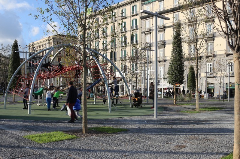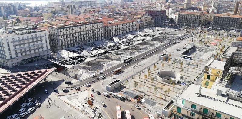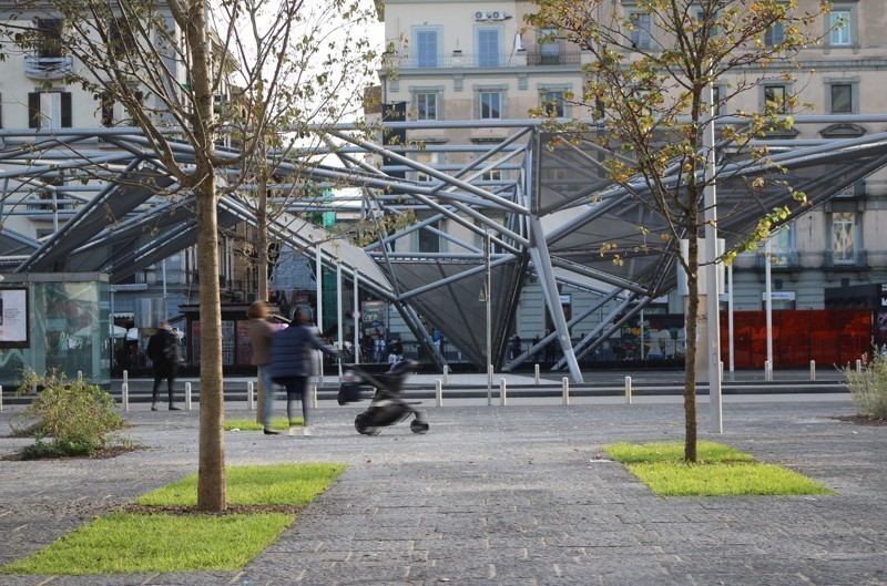 Con l'ultimo taglio del nastro (il secondo per la piazza) è stata aperta tutta la parte nord dell'immenso invaso (al di sotto si estende un grande parcheggio interrato). Un'area con 130 alberi, spazi per la sosta, un anfiteatro, piccoli chioschi, un campo per il calcetto, uno per il basket e un'area gioco. A commissionare il progetto all'architetto francese (dell'intera piazza e della stazione della linea 1) fu nel 2004 la società Metropolitana di Napoli SpA. All'inaugurazione del 2013 ne seguì un'altra il 24 aprile 2015, quando fu completata la porzione sud del grande spazio urbano: ossia la galleria commerciale semi-ipogea, posta ad otto metri al di sotto della quota della piazza e ombreggiata da una "foresta di alberi di acciaio" che sale in superficie, dando carattere e vivacità allo spazio pubblico.