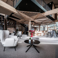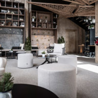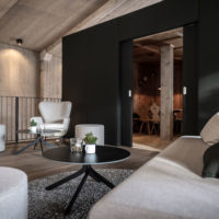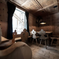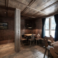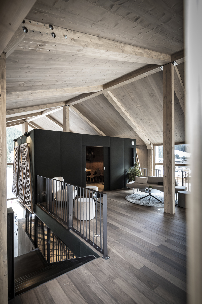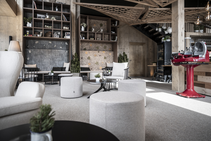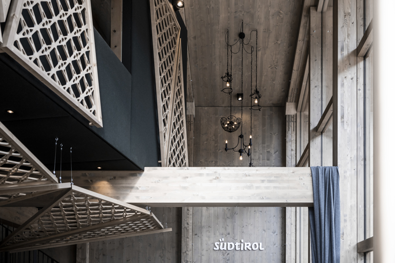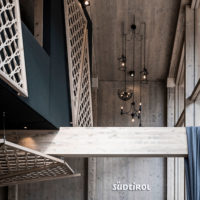 Non c'è elemento o dettaglio che non sia stato studiato nei minimi particolari. La sfida: generare un ambiente coerente nonostante le tante sfaccettature derivanti dall'applicazione di più idee e anche di più epoche. Tutto: accessori, mobili, superfici sono stati prodotti, raccolti o progettati in Alto Adige, lasciando anche spazio alla storia. Ogni sedia disposta attorno alla grande tavola, ad esempio, proviene da una fattoria diversa e narra la sua storia. Al secondo piano, in un grande cubo scuro che fluttua sopra alle cucine a vista, è racchiusa un'antica stube restaurata, con le tipiche lampade e l'angolo del crocefisso.