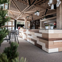All'ingresso si è accolti da un grande bancone da bar, ma che funziona anche come cucina a vista. Questo può ruotare sul suo asse centrale rendendo ancora più dinamico lo spazio. il bancone rappresenta la varietà del paesaggio naturale locale grazie ai listelli di legno di diverse essenze. Le parti frontali sono infatti rivestite da elementi di legno di melo, pero, abete rosso, larice, quercia, noce, cedro e pino cembro.