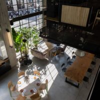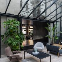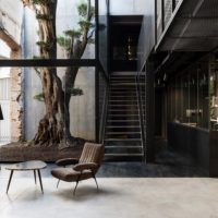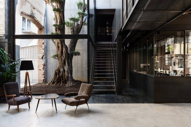 Nel periodo di abbandono, il tetto del capannone era stato forato per introdurvi una gru a servizio di un vicino cantiere edile. «Ciò che sembrava un danno lo abbiamo trasformato in opportunità. Abbiamo deciso di non chiudere quel foro e vi abbiamo calato un ulivo di 700 anni, alto circa 12 metri», racconta ancora l'architetto. L'ulivo, posto dunque all'interno del locale, è stato inserito in una teca di vetro.