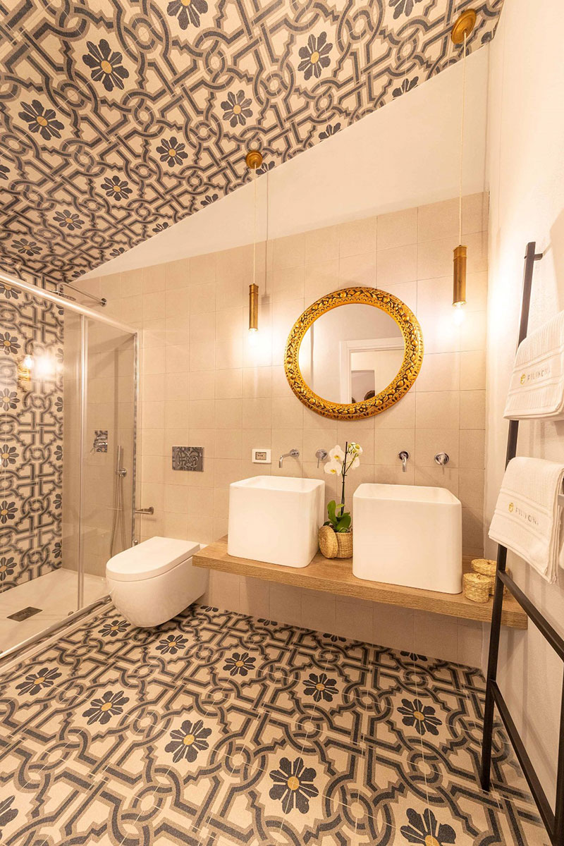 "L'intento - prosegue Spataro - è stato quello di riprodurre con oggetti, piante e utensili antichi un clima capace di stimolare il cliente alla conoscenza delle tradizioni, dei colori e della cultura artigiana siciliana." Ecco perché ogni camera presenta a pavimento delle piastrelle decorate con motivi appartenenti alla memoria iconografica isolana, pattern che dall'ingresso si sviluppano con continuità nei rispettivi bagni salendo dalle pareti delle docce sino a toccare i soffitti. E la stessa palette cromatica utilizzata ruota intorno ai colori caldi della terra e del mare, dagli ocra, ai gialli, dall'avorio ai blu.