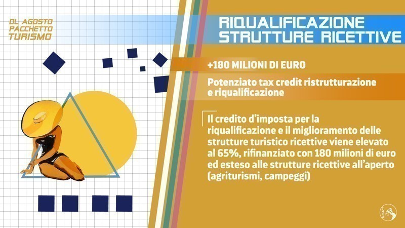 Il Dl Agosto potenzia il tax credit per la ristrutturazione e la riqualificazione delle strutture ricettive: il credito di imposta sale al 65 per cento e viene esteso agli agriturismi, ai campeggi e agli stabilimenti termali. La misura viene rifinanziata con 180 milioni di euro per gli anni 2020 e 2021.