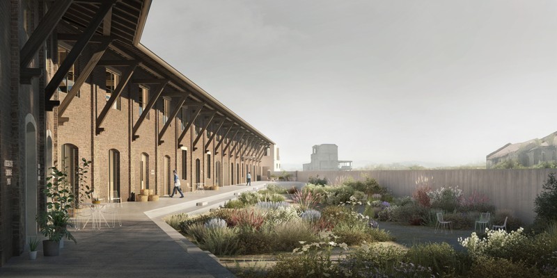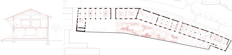 In particolare, il limite verso la ferrovia assume un nuovo significato: pur preservando l'introversione dell'immobile, viene prevista l'apertura di un varco, che mette in connessione la strada con un giardino «segreto, odoroso, colorato» - lo definiscono i progettisti -: un nuovo spazio semi-pubblico ricavato sul lato della ferrovia dal quale si ha accesso alle diverse funzioni. Qui viene creata una passeggiata soprelevata coperta, che funziona anche da seduta, ricavata conservando la banchina di carico esistente.