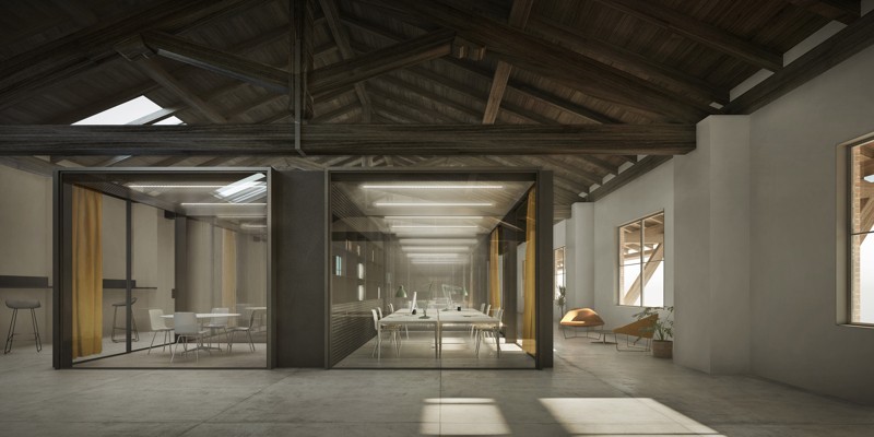 Quanto agli interni, la generosità degli spazi, nati per lo stoccaggio e la movimentazione di derrate agricole, viene riconosciuta come un'eccezionale qualità e dunque preservata. La continuità spaziale interna non viene compromessa e la transizione tra le funzioni viene risolta con semplici divisori trasparenti.
