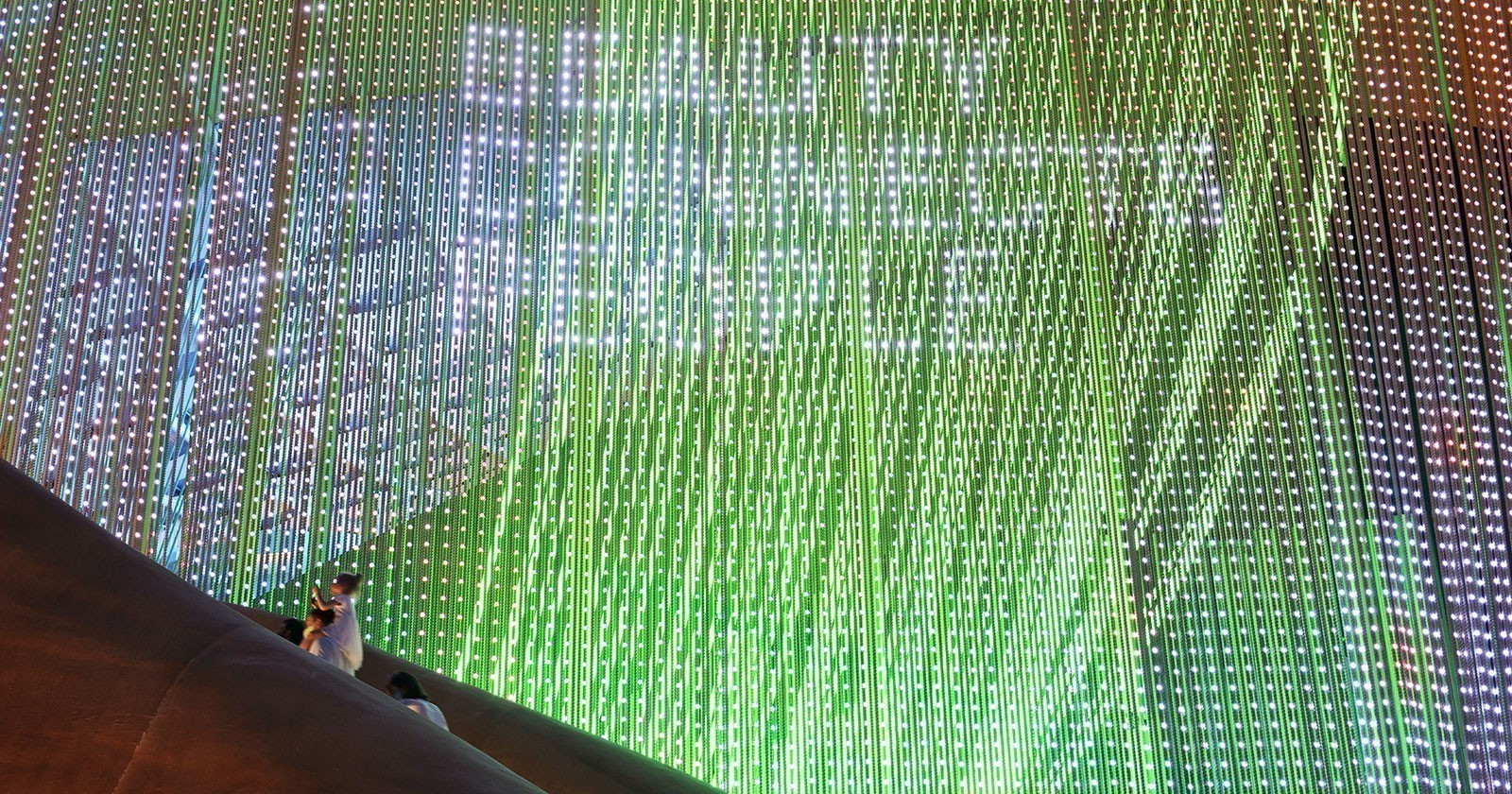 Nessuna parete chiude il volume, che invece è delimitato da una facciata multimediale a tenda realizzata con corde nautiche. La facciata si illumina e diventa dinamica grazie ai Led incorporati sulle corde. Le stesse corde, prodotte in plastica riciclata usando l'equivalente di quasi 2 milioni di bottiglie d'acqua, sviluppano un intreccio verticale che si estende per quasi 70 chilometri di lunghezza complessiva. Dopo la conclusione di Expo, le corde saranno riutilizzate. Tra l'altro, proprio l'impiego delle corde nautiche, insieme a un sistema di raffrescamento localizzato con nebulizzatori, consente di ottenere ombreggiamento, ventilazione naturale e dunque un migliore comfort termico.