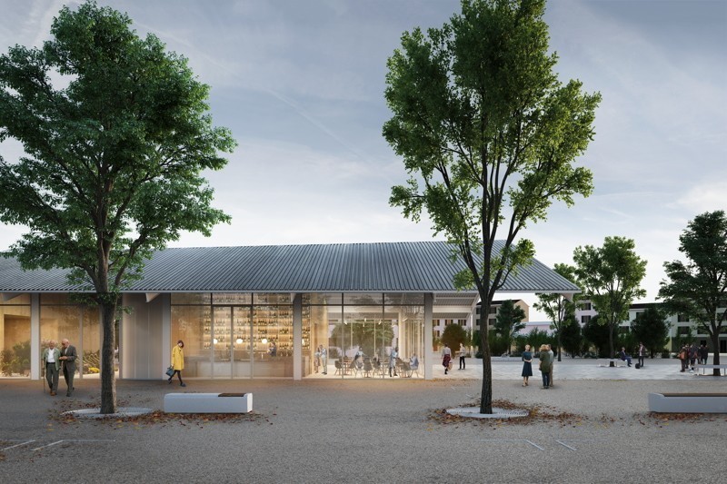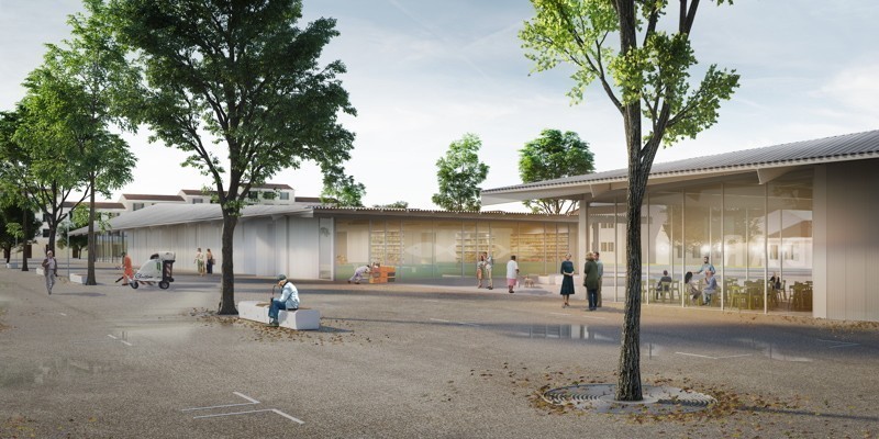 L'elemento principale che domina lo spazio è costituito dall'ampio tetto in grecata metallica che caratterizza i due corpi di fabbrica. La piazza sarà uno spazio flessibile, facilmente raggiungibile e capace di ospitare molteplici funzioni. Per l'asse centrale, in corrispondenza dei due edifici, i progettisti hanno immaginato di inserire una pavimentazione in pietra chiara, mentre per la parte che ospita i banchi del mercato hanno previsto un rivestimento in cemento lavato. L'arredo urbano è legato alle aree verdi grazie a un sistema alberature e panche circolari disposto in maniera uniforme all'interno del lotto. Un sistema di illuminazione a Led consentirà di illuminare la piazza anche durante le ore notturne, garantendo la sicurezza e l'utilizzo in qualsiasi momento.