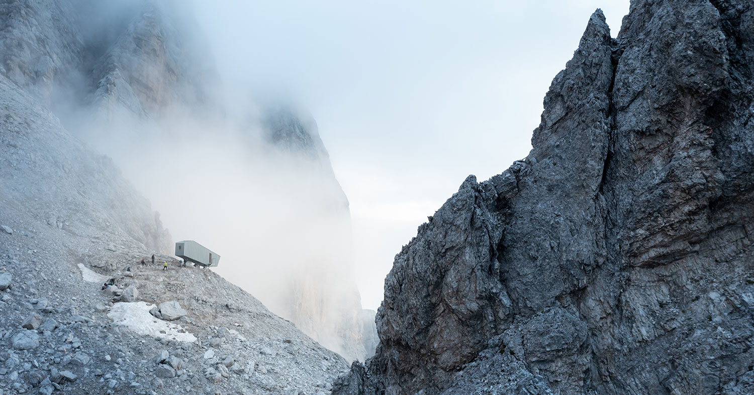 Esternamente il suo aspetto formale assume i tratti di un volume sbozzato sospeso su di un crinale irto, un corpo in attesa proteso nel vuoto, intento ad aprire una dimensione spaziale al di là dalla propria geometria interna. Un volume definito dalla natura, un'architettura caratterizzata da un profilo fortemente inclinato che si adatta all'orografia delle Marmarole.