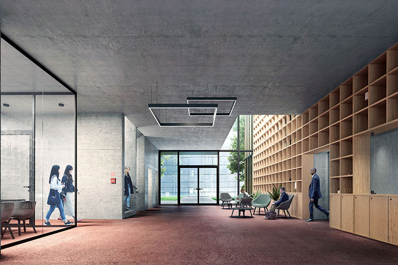 Varcato l'ingresso, gli spazi ruotano attorno a due patii trasparenti ospitanti altrettanti giardini, che consentono l'ingresso della luce. Alla base del progetto di interni vi è quindi l'apertura visiva, l'interscambio conoscitivo, e la natura, intesa come elemento di vivibilità e ispirazione. Qui le persone sono al centro con la loro socialità, i loro spazi di ideazione, il desiderio di lavorare e abitare un ambiente confortevole.