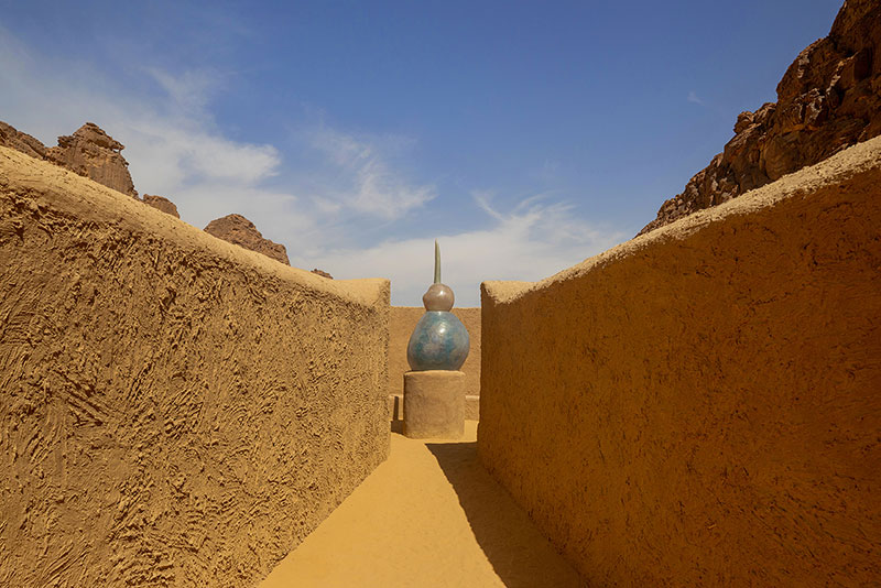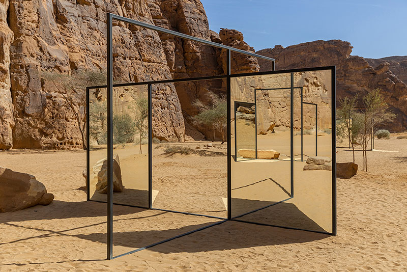 La struttura di fango di Sultan bin Fahad ha la forma di un aquilone del deserto, con specchi sulla facciata che evocano un miraggio, e ospita una scultura a forma di urna con quattro simboli protettivi tradizionalmente usati nelle tombe nabatee.
