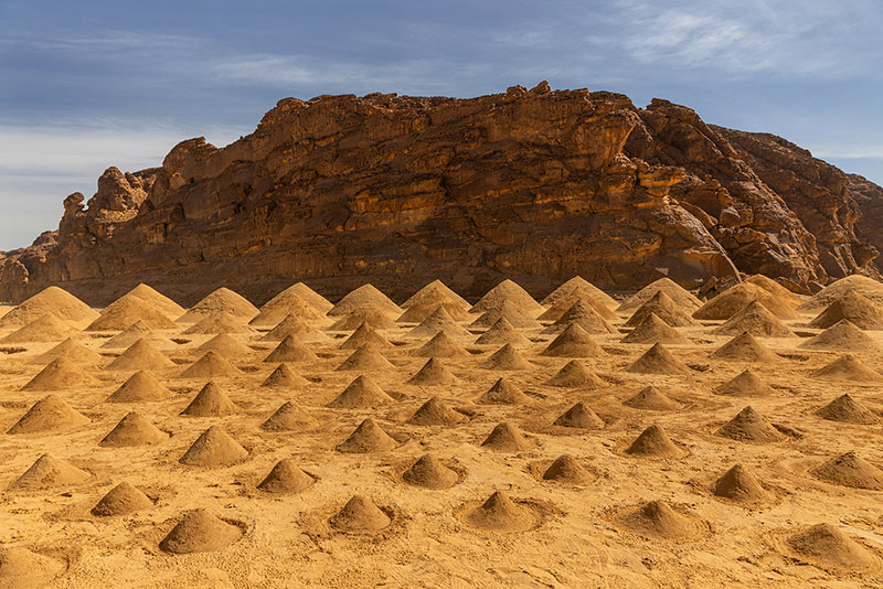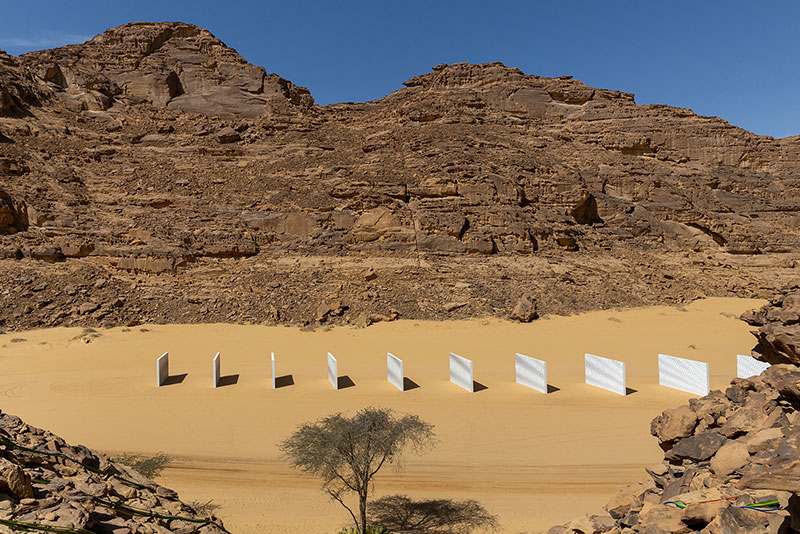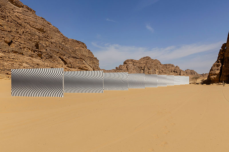 Claudia Comte presenta una progressione di muri che impongono la loro presenza architettonica all'interno dell'ordine naturale dei canyon di AlUla, dove ciascuno porta una sezione di un modello algoritmico più ampio, relativo alle forme ondulate che modellano il suono e la superficie del deserto.