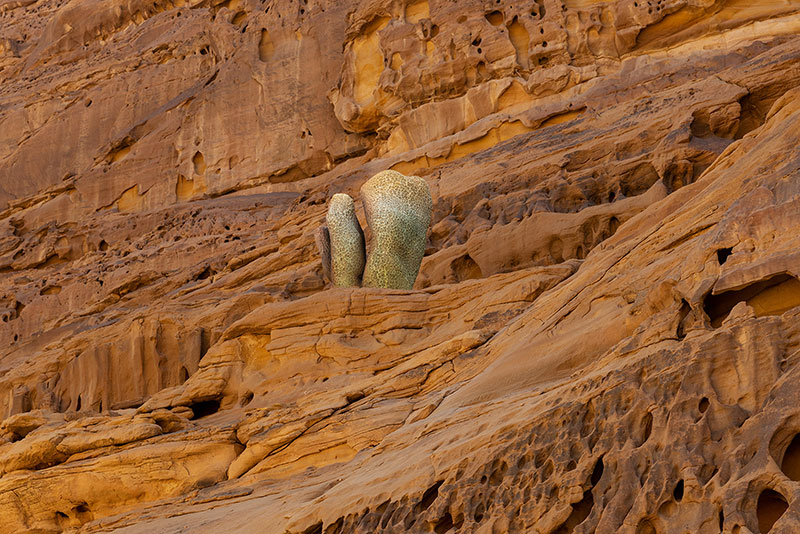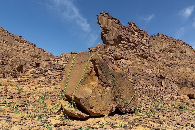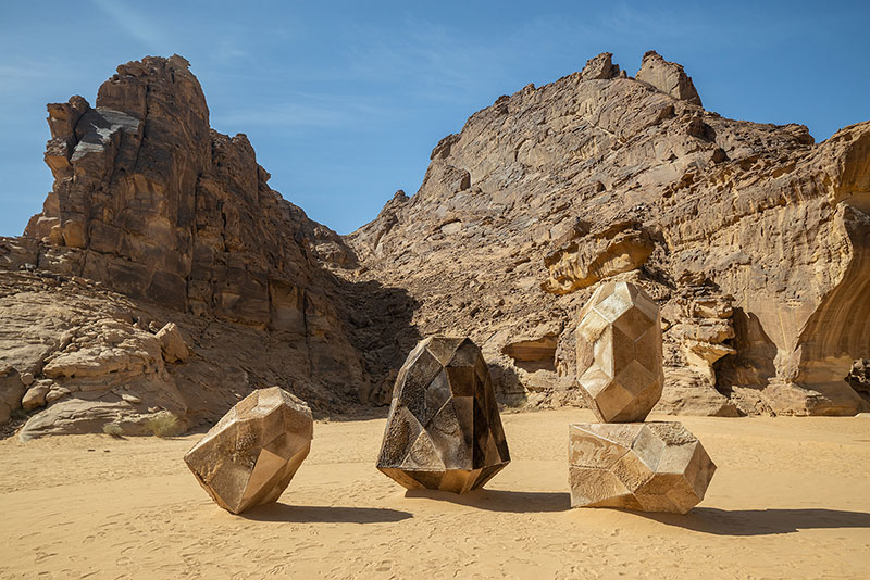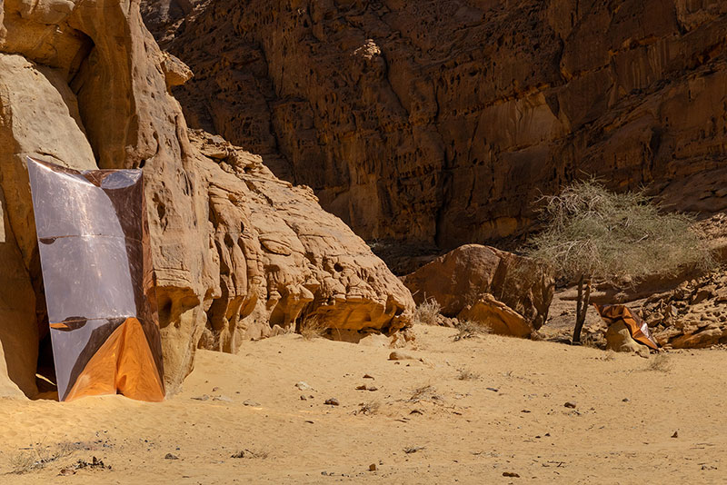 Le lunghe strutture gonfiate in acciaio di Shaikha AlMazrou si incuneano nei vuoti delle rocce, in equilibrio nel paesaggio, occupando lo stato liminale tra stasi e movimento, creando una composizione silenziosa ma imponente sospesa nell'inerzia.