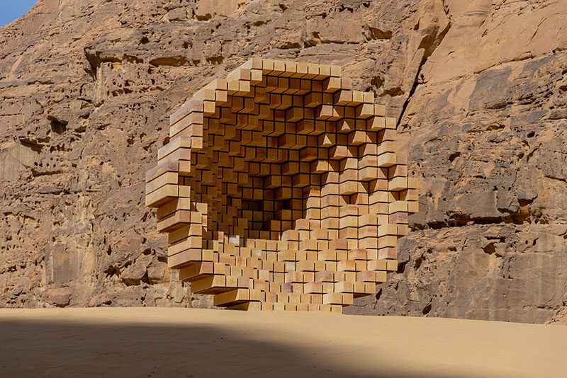 Dana Awartani si lascia ispirare dall'architettura vernacolare di AlUla, con un'installazione che prende la forma di una scultura geometrica concava (richiamo alle tombe nabatee) e imita le forme delle montagne e delle gole circostanti.