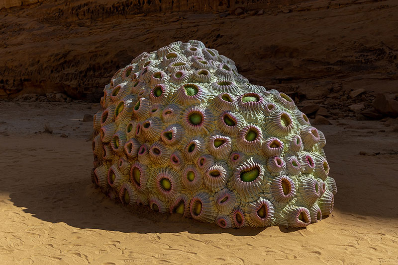 Il lavoro di Shezad Dawood esplora le idee del tempo profondo e la relazione geo-biologica tra il suolo del deserto e il vicino Mar Rosso attraverso una coppia di forme simili a coralli le cui superfici sensibili alla temperatura riflettono gli effetti del cambiamento climatico e la continua lotta dell'umanità per trovare un rapporto sostenibile con un ecosistema in rapido cambiamento.