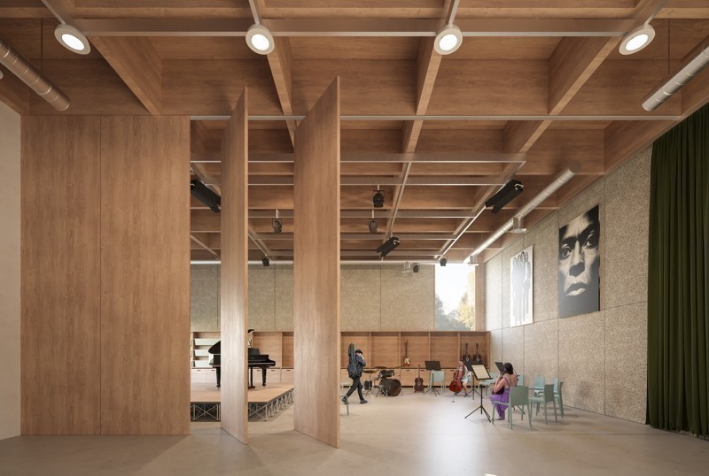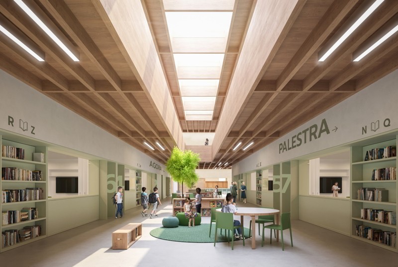 Il legno, scelto come materiale strutturale e caratterizzante, contribuisce, insieme alla luce zenitale, alla creazione di spazi caldi, confortevoli e studiati per favorire la socializzazione, l'apprendimento e il benessere.