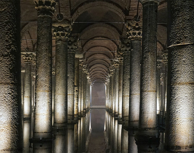 Nata come opera idraulica per fornire l'acqua al palazzo imperiale e ai luoghi limitrofi, la Cisterna Basilica di Istanbul - Yerebatan Sarayi (questo il nome turco che significa "Palazzo Sommerso") - risale all'epoca dell'imperatore Costantino, poi ampliata nel 532 dall'imperatore Giustiniano durante il periodo d'oro dell'Impero Romano d'Oriente. Per tutto il Medioevo venne dimenticata, riscoperta nel XVI secolo per essere riaperta al pubblico solamente nel 1987, con un'affluenza di pubblico pari a quella del Louvre e del Colosseo.