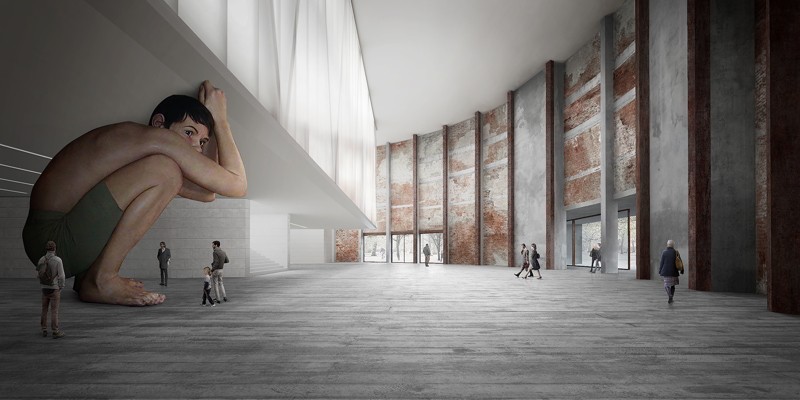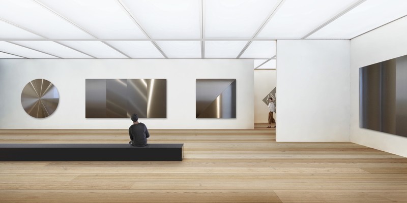 L'area espositiva del museo, in verità, inizierà già al piano terreno: il foyer a tutta altezza è pensato come uno spazio multifunzionale attrezzato per esposizioni di opere di grandi dimensioni. Questo spazio ospita inoltre il bookshop e salette didattiche informali per attrarre il pubblico più giovane.