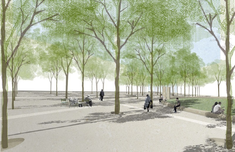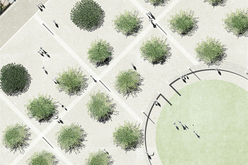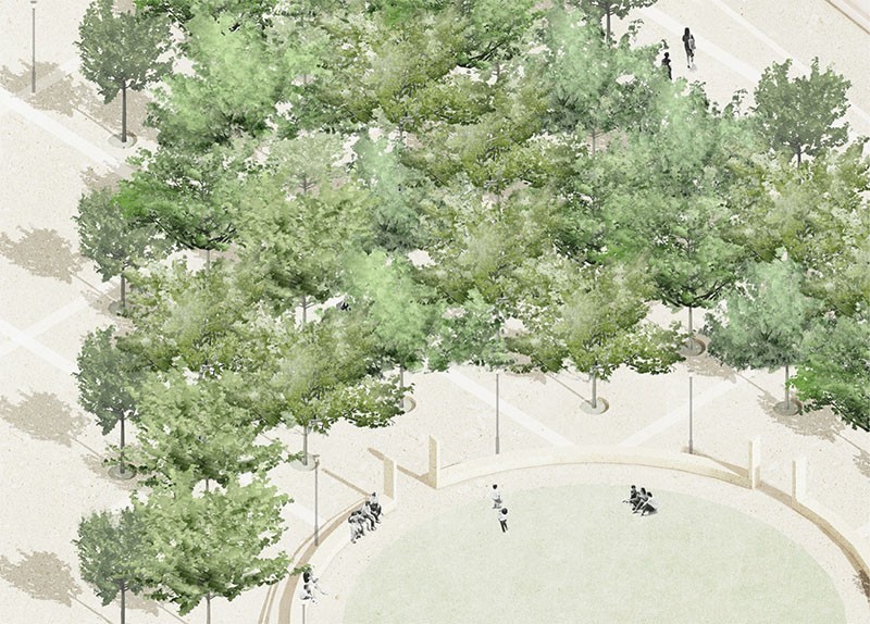 La piazza, oggi pressoché priva di zone d'ombra, sarà delimitata a nord e ad ovest dal verde degli alberi e sud da un piccolo boschetto sistemato su un suolo leggermente in pendenza. Il ridisegno della piazza con l'inserimento del verde comporta anche la riduzione di suolo impermeabile.