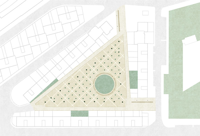 L'obiettivo è trasformare in un luogo di relazione un vuoto urbano di forma triangolare cinto da tre fabbricati di edilizia residenziale popolare. Da luogo non vissuto, privo di qualsiasi qualità, a piacevole spazio pubblico di sosta e di incontro: il progetto è di una grande piazza da sviluppare al di sotto di un tetto verde, rappresentato dalle chiome di 59 alberi di alloro e interrotto nel mezzo in corrispondenza di una radura circolare delimitata da una seduta continua che ne disegna i margini.