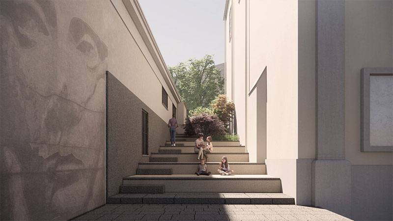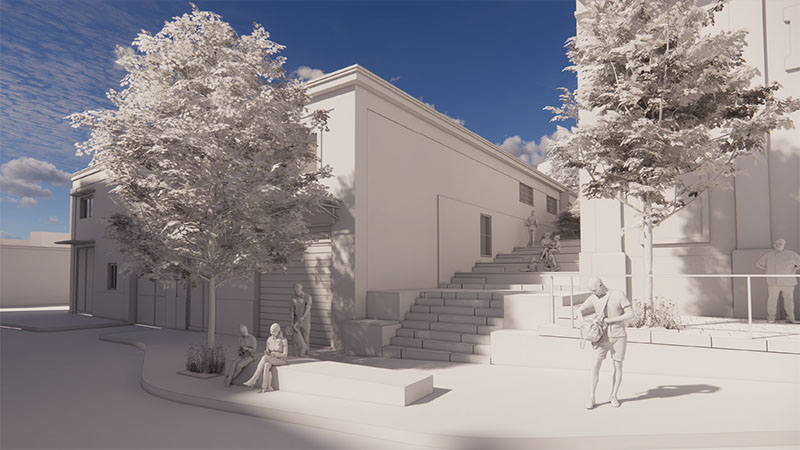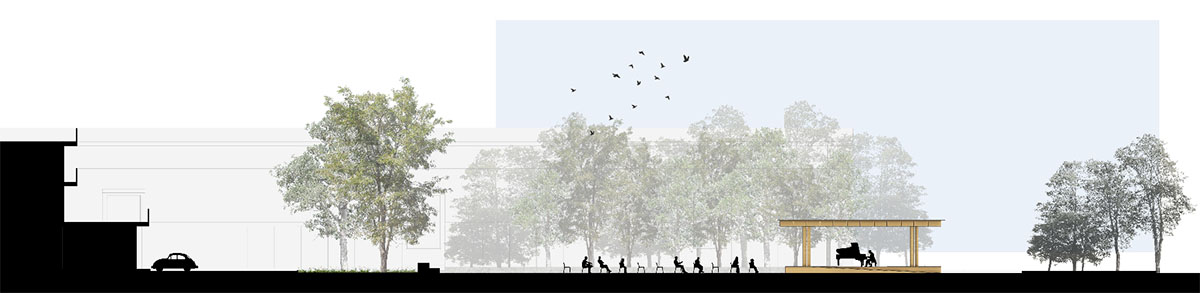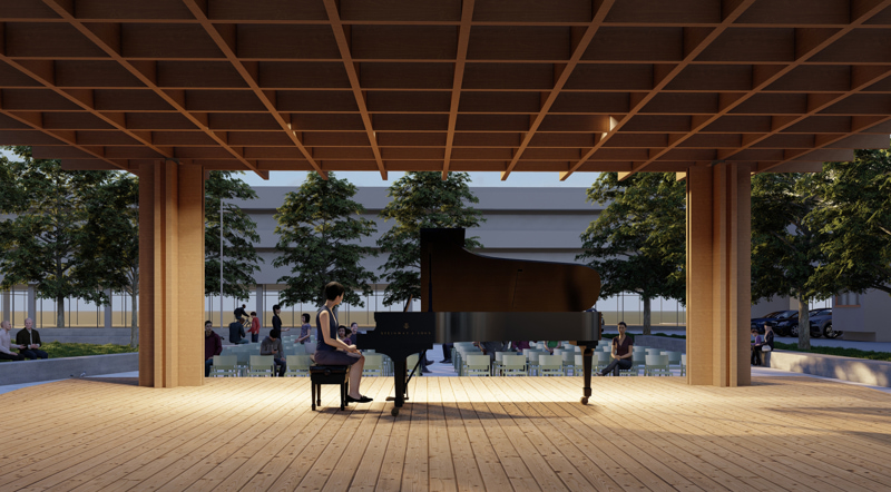 È in corso lo sviluppo del progetto del padiglione in legno, pensato in modo da non avere zone cieche che potrebbero generare problemi di sicurezza. Al momento, il progetto prevede la realizzazione di un padiglione elevato su un piccolo podio, con pilastri a croce e un soffitto a cassettoni. Ora andrà definito nel dettaglio il progetto strutturale.