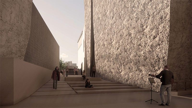 Modellazione del suolo anche per l'ingresso al cimitero in modo da conquistare una permeabilità fisica e visiva tra lo spazio pubblico della piazza e la suggestiva fessura che si apre nel banco tufaceo proiettando il visitatore nel mondo sotterraneo delle gallerie ipogee e dei teschi oggetto di un'antica devozione popolare.