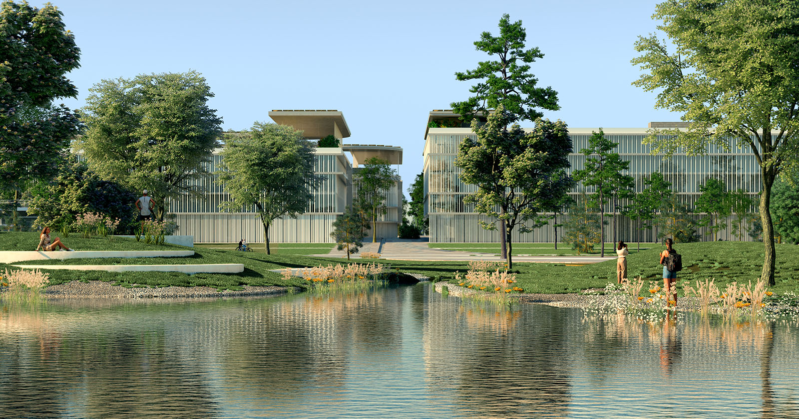 Dunque, la prima azione progettuale è la creazione del parco verde, coerente con la necessità di incrementare il processo di forestazione urbana, di arricchire e integrare la biodiversità locale e di creare un grande spazio pubblico all'interno della città, fulcro e attrazione del nuovo quartiere e ponte verso le aree di prossimità. In questo originale contesto si innesta il costruito, il "nuovo polo giudiziario", non semplice sede amministrativa della Giustizia, ma elemento catalizzatore e trainante di un quartiere "attivo", dotato di servizi e spazi attrezzati all'aperto per tutti i fruitori. I percorsi ciclo-pedonali tra nord e sud del quartiere costituiscono una sorta di porta di accesso alle aree funzionali pensate per gli edifici della giustizia.
