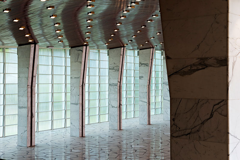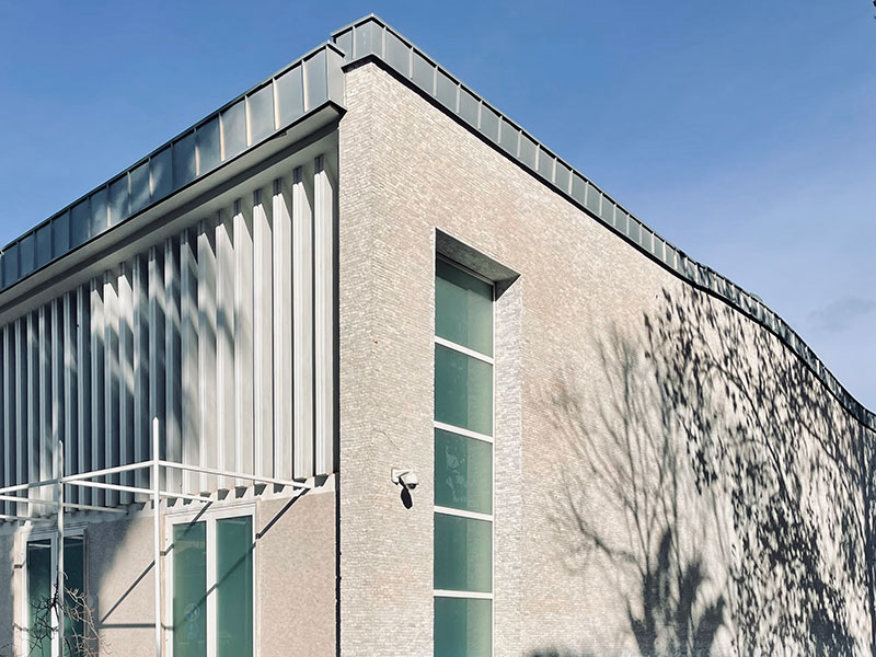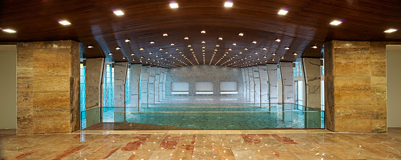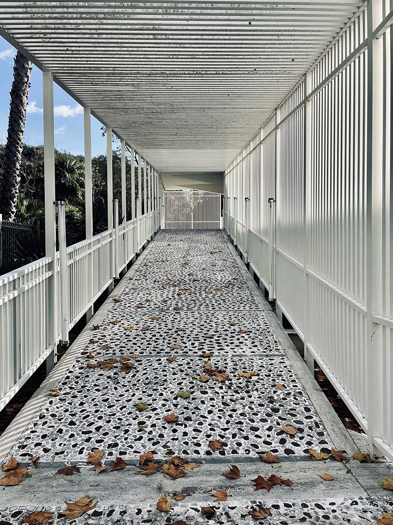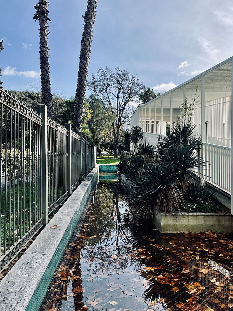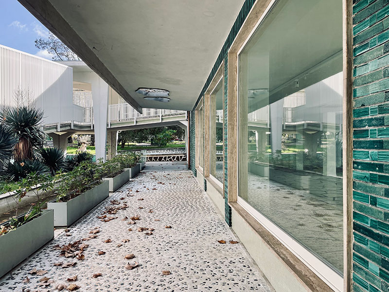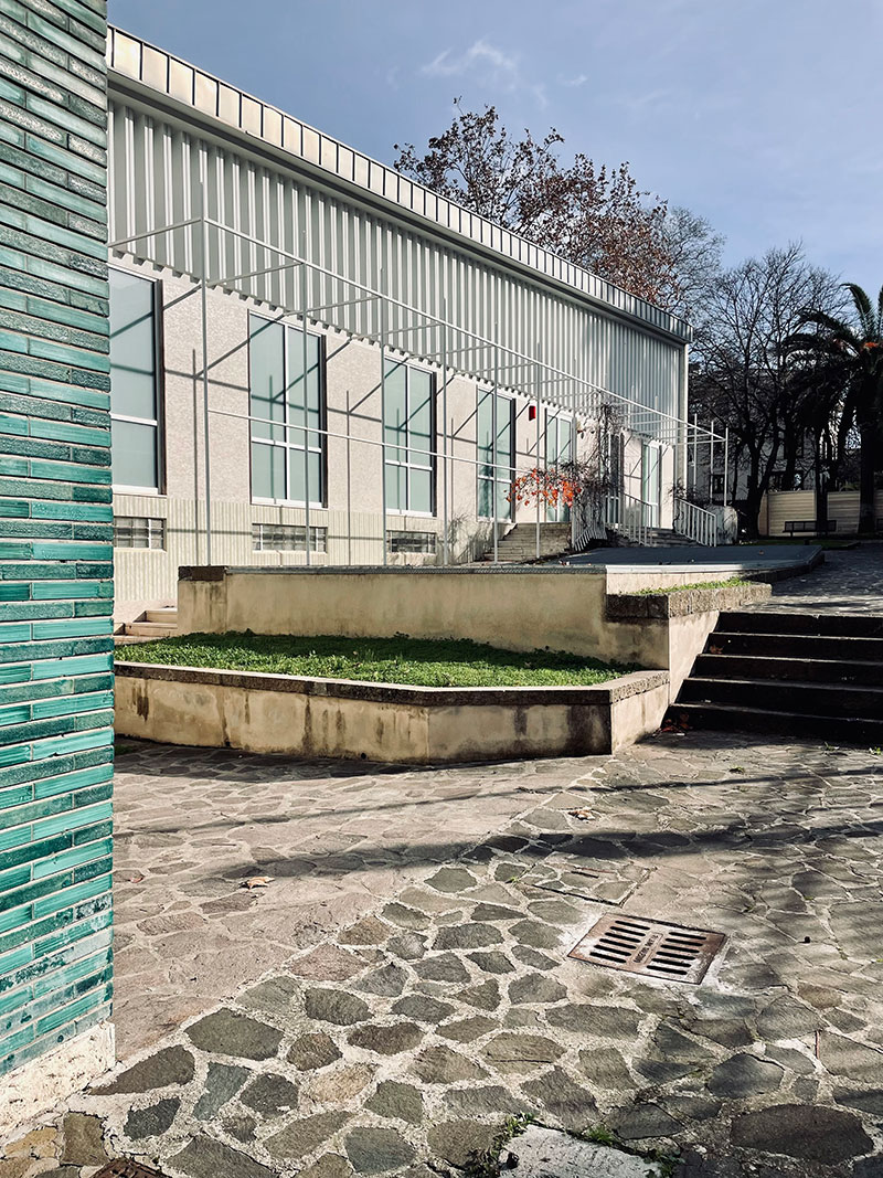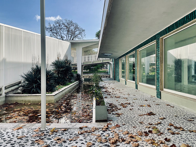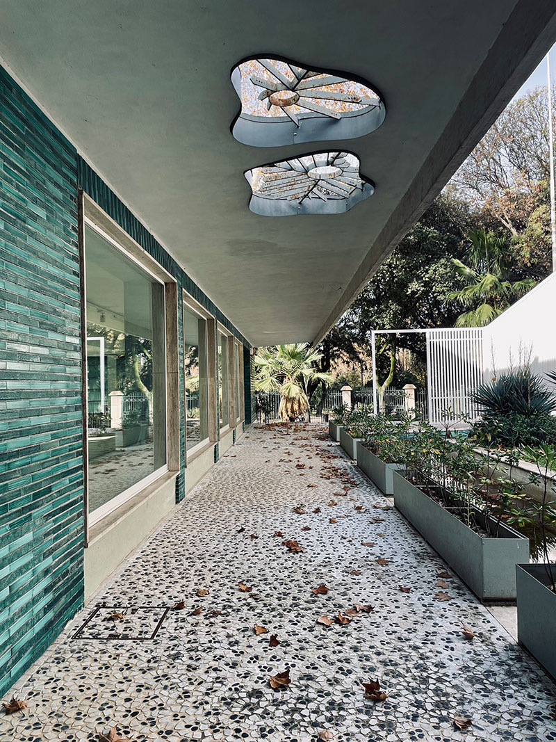 L'intersezione tra i due volumi si caratterizza, invece, per la presenza di una galleria coperta che, attraversando il padiglione, rappresenta un percorso pubblico privilegiato di ingresso al giardino.