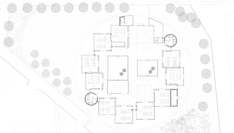 La scuola a pianta circolare, immersa in un giardino che conserva gli alberi esistenti, si sviluppa su un unico livello, comprendendo 10 aule. L'ingresso principale conduce ad un ampio atrio illuminato da una serie di lucernari scavati nel volume di copertura. «Dall'atrio, un generoso sistema di spazi collettivi, illuminato zenitalmente da lucernari e articolato attorno a due corti centrali, si espande in tutte le direzioni. È un sistema fluido, si contrae e si dilata generando 'spazi delle potenzialità' flessibili e a disposizione delle esigenze e della creatività della comunità. In particolare, una 'piazza circolare' opposta al grande atrio di ingresso e attrezzata da una tenda, si presta ad ospitare attività speciali e teatrali», spiegano ancora gli architetti.